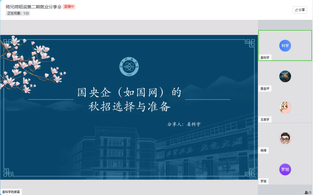 首先,签约国网湖北电力有限公司的姜科宇师兄以“央企的秋招选择与准备”为主题进行了分享。姜师兄就央企名单、信息来源、秋招准备、心路历程、面试经验等方面向同学们提供了央企秋招的一些实用建议。他建议大家在求职前要有明确的自我认知,多了解企业真实情况,结合自身情况选择对应的赛道。