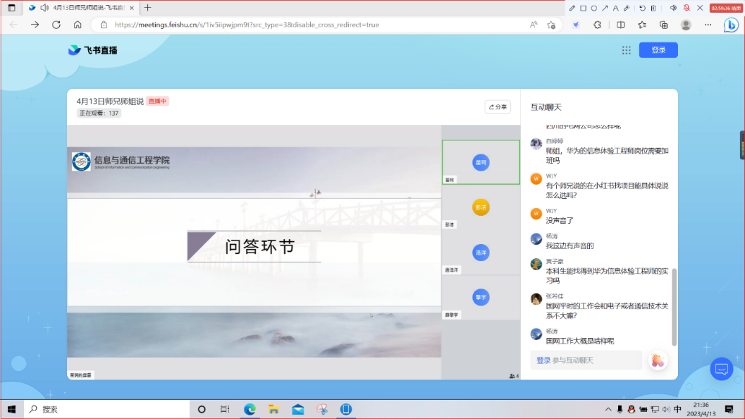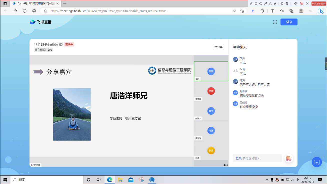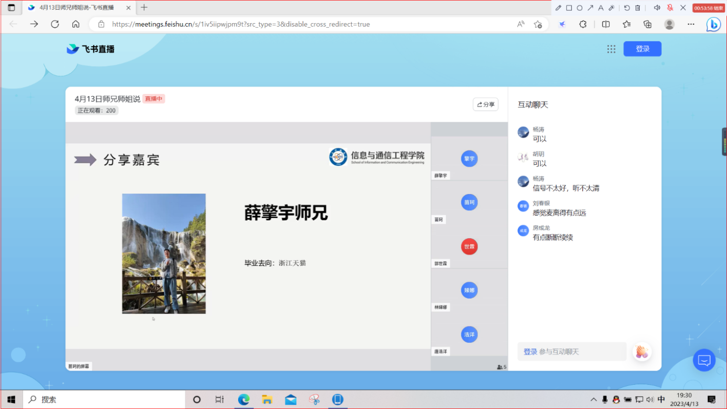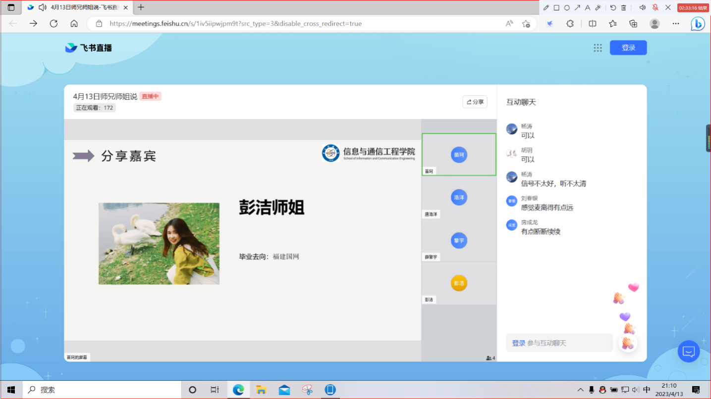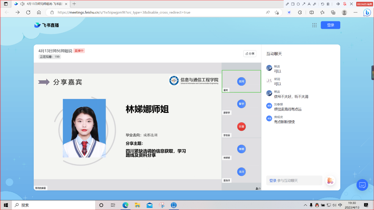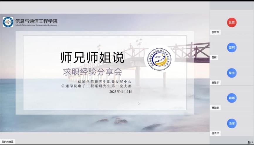 2023年4月13日晚,新葡的京集团35222vip研究生职业发展中心联合电子工程系研究生第二党支部在线上成功举办“师兄师姐说”第三期求职经验分享活动。本次活动的嘉宾分别签约互联网企业、国防单位、基层选调和国家电网,吸引200余员工参与。本次分享会包括嘉宾分享环节和互动问答环节。