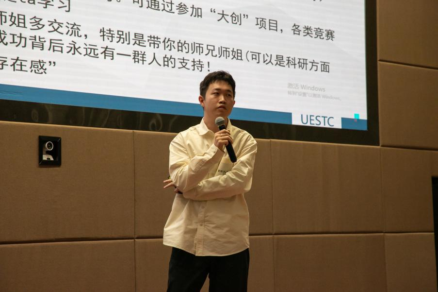 彭敏,推免综合排名专业第一,连续三年获国家奖学金,优秀员工一等奖学金,连续三年学习成绩排名专业第一。以第一发明人身份申请国家发明专利一项,主持一项院级大创获优秀结题。获蓝桥杯全国总决赛二等奖、数学建模省一等奖、数学竞赛省一等奖等各类奖项十余项。直博至通信抗干扰全国重点实验室进行深造。彭敏同学回顾了自己大一学年的学习生活,强调了时间规划的重要性,鼓励同学们结合自身情况早做规划早做准备。在分享的最后,彭敏同学祝福在场的同学们:“只争朝夕,不负韶华”。