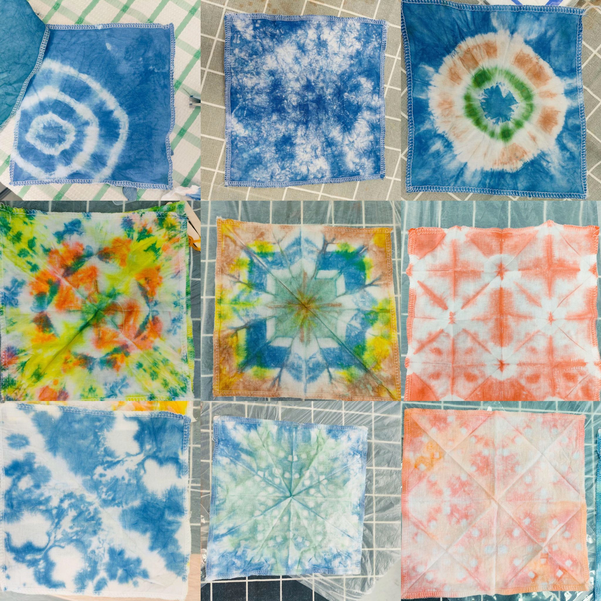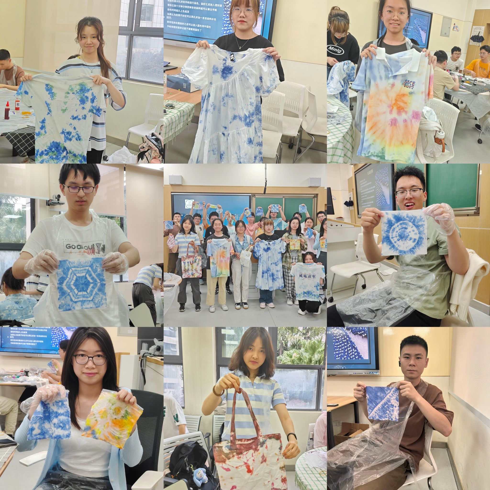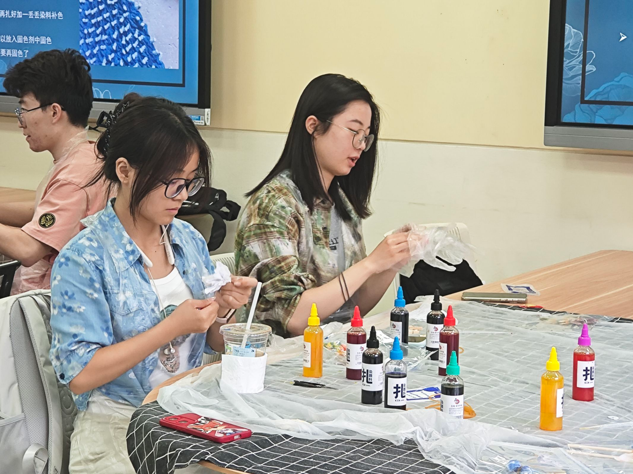 接下来,大家开始动手体验扎染的制作过程。本次活动除了为同学们准备了方巾作为原料,还鼓励同学们将闲置的衣物、帆布包等物品利用起来,赋予它们新的生命。在设计图案和扎结布料后,同学们将布料浸入染料中,期待独特的图案在布料上呈现。染色完成后,部分作品还进行了固色处理,以保持颜色的鲜艳和持久。整个过程中,同学们沉浸在创造的乐趣中,体验到了扎染艺术的独特魅力。