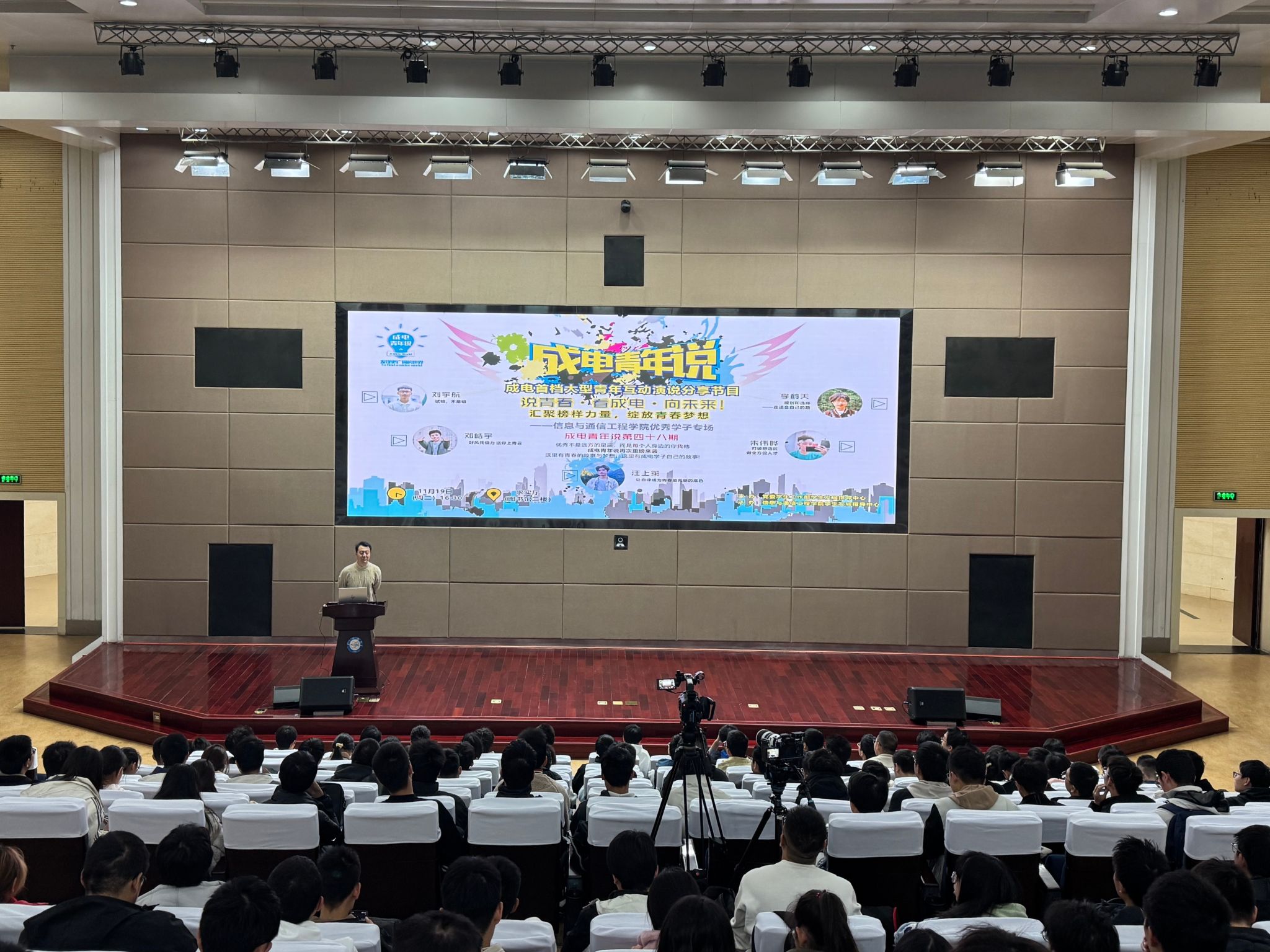 11月19日,公司大型青年互动演说分享节目“成电青年说”第48期:“汇聚榜样力量,绽放青春梦想”——新葡的京集团35222vip专场在图书馆求实厅开讲。活动邀请到新葡的京集团35222vip优秀学子刘宇航、邓皓宇、汪上策、朱伟晔、李鹤天同学分享他们的学习心得、科研经验和成长感悟。