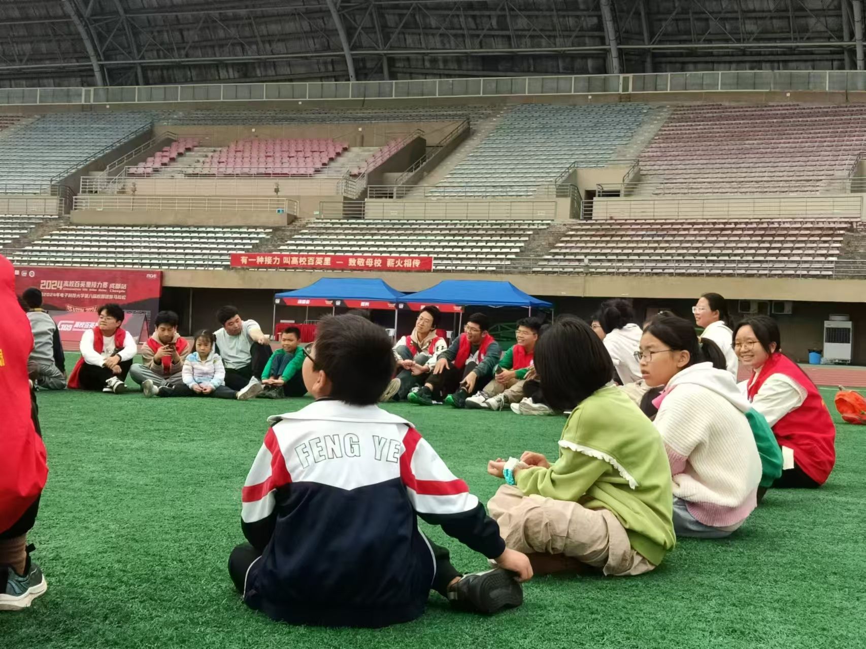 在体育场,志愿者们带孩子们围坐成一个圆圈,玩起了丢手绢的游戏。随着轻快的音乐响起,小朋友们迅速投入其中,手绢在孩子们的手中轻盈飞舞,兴奋的笑声、欢快的脚步,大家渐渐放下了初见时的拘谨与羞涩,小伙伴们彼此之间迅速熟悉起来。