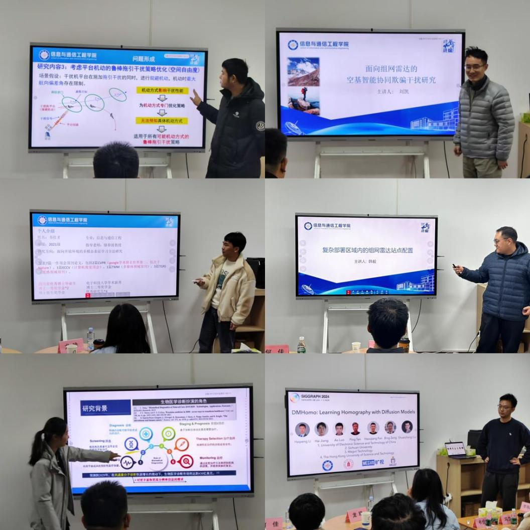 目前,讲坛已成功举办三期,来自雷达与对抗、图像处理等研究方向的优秀博士生依次登台,围绕多站雷达布站、单应性矩阵、图像质量评价方法与应用等前沿领域展开报告。每场报告均设有专家点评环节,张天贤、袁野、龙珍等老师从应用前景、理论深度、技术路径、汇报技巧等维度给予了专业指导。