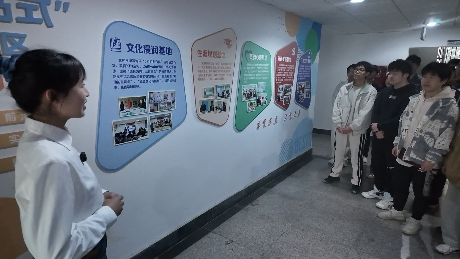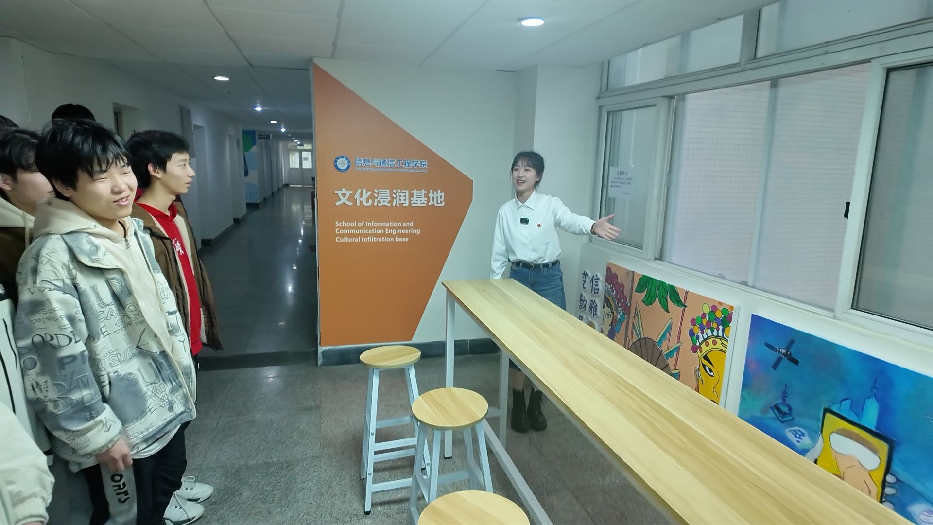 宣讲员成员杨涔可首先解读了“家”门口的文化基站的建设理念。作为校级文化浸润基地,公司立足学科特色,创新构建了“三频共振”特色文化育人体系。红色文化如同穿透力强的低频基底信号,夯实信仰根基;传统文化如同增强共鸣的中频谐波,持续滋养文化自信;学科文化如同能量报表的高频脉冲,激发创新动能。“家”门口的文化基站将这三种信号在宿舍生活区交织共振,形成覆盖同学们成长全周期的文化浸润频谱。