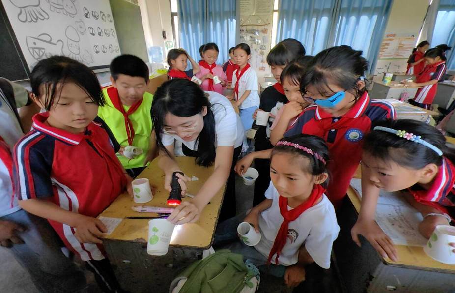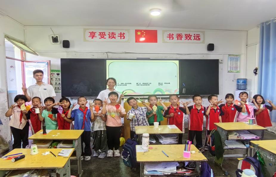 在天马镇白岩坪小学,实践队队员为孩子们带来了一场充满趣味与温情的手工互动课堂。团队成员提前准备好纸杯、手电筒、彩纸、颜料等材料,耐心讲解纸杯投影仪的成像原理与制作步骤,每一个环节都做到细致演示、手把手指导。当自己制作的纸杯投影仪投射出斑斓的光影时,孩子们脸上洋溢着惊喜与自豪。实践队通过这样充满温度的手工互动,传递着来自远方的关怀,让温暖悄然流淌在每个孩子的心田。