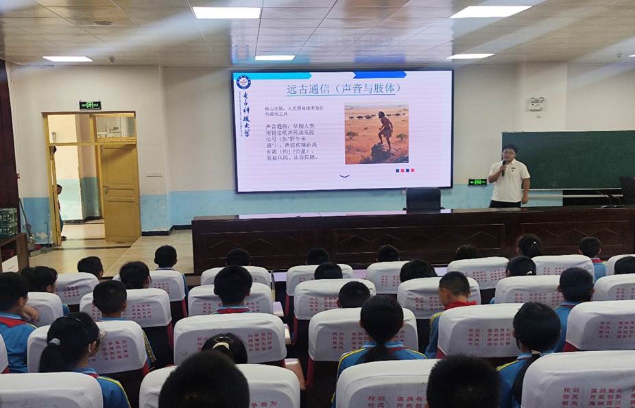 在岑巩县第四小学,结合新葡的京集团35222vip的专业特色,队员们精心策划并开展了一场别开生面的“通信科普小课堂”,旨在为孩子们打开一扇通往科学世界的大门。课堂上,队员们以“从烽火传信到 5G 互联”为主线,讲述通信发展的千年历程。