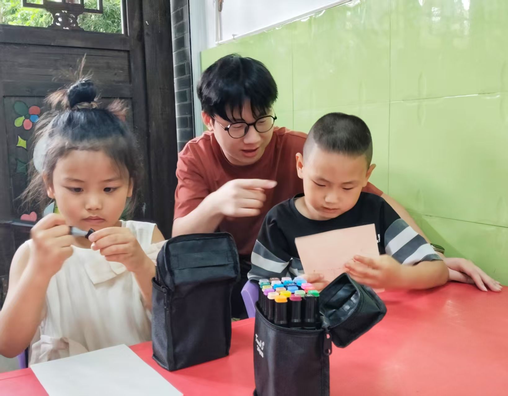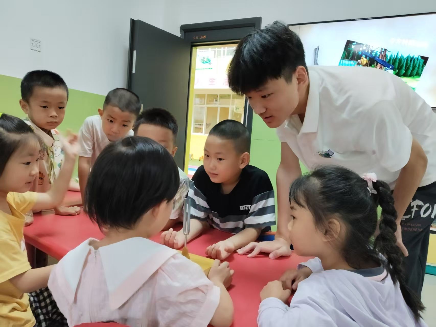 在银花湖英才幼儿园,实践队开展“科技启蒙”主题微课堂。队员们通过“音叉实验”和“绘画接龙”两个互动活动引导小朋友们探索信息传递的奥秘,用孩子们听得懂的语言讲解科技原理。