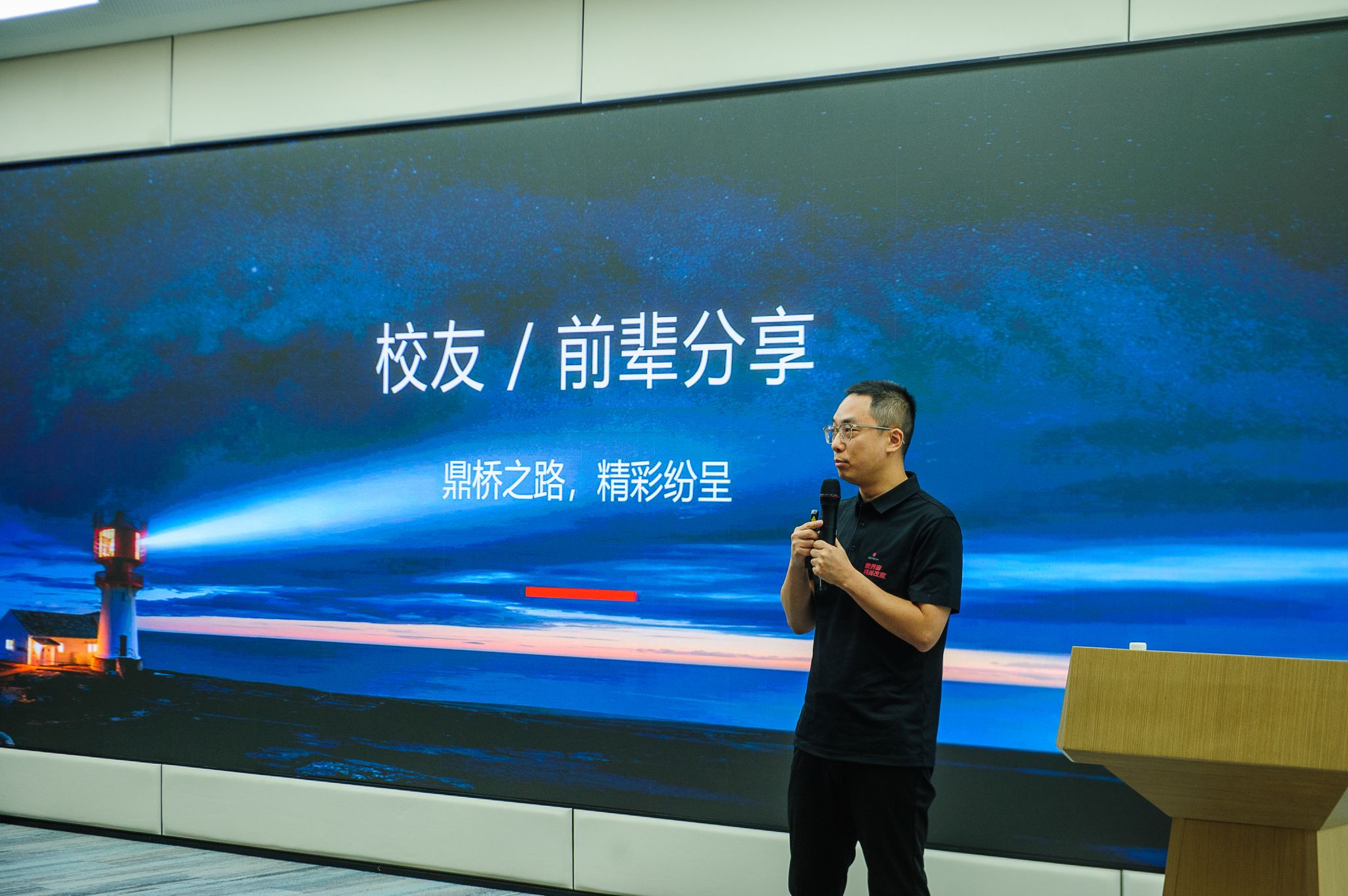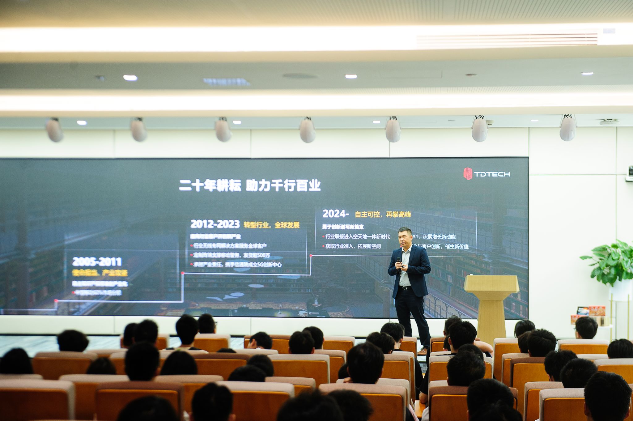 展厅参观结束后,活动进入分享交流环节。首先由鼎桥技术副总裁、研发部部长郭大华进行分享。他以“公司发展与行业趋势”为主题,全面介绍了鼎桥技术的战略布局,包括在技术研发上的投入方向、未来业务拓展的重点领域;同时结合自身深耕行业多年的经验,深入剖析了当前通信与信息技术领域的前沿动态,解读了产业发展面临的机遇与挑战。郭大华强调,行业发展对人才的需求正从“单一技能型”向“综合创新型”转变,鼓励同学们既要夯实专业基础,也要主动关注跨领域知识的学习,为适应行业发展做好准备。