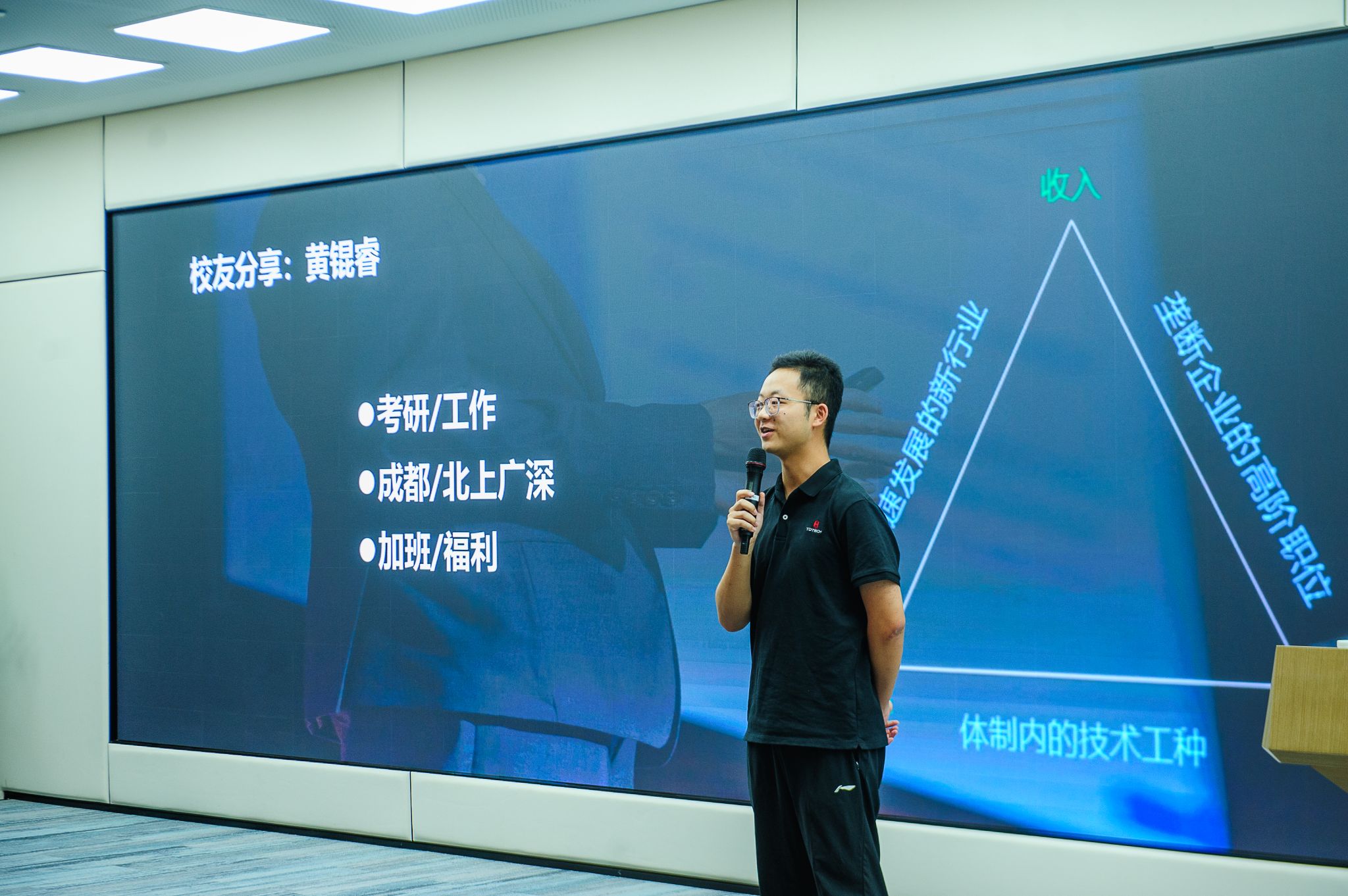 随后,两位在职员工先后分享了个人职业成长经历。2010届员工、公共关系部部长、5G创新中心主任梁永谦结合自身从求学步入国有企业、民营企业的工作经历与不同阶段的岗位变化,勉励同学们要保持好奇心、上进心、敬畏心,聚焦个人优势,做好职业规划。2025届员工、融合通信开发部黄锟睿分享了自己从校园到职场的适应历程,建议学弟学妹们入职初期要主动学习、多问多练,快速完成角色转变,掌握团队协作中的沟通技巧,更好地融入职场环境。