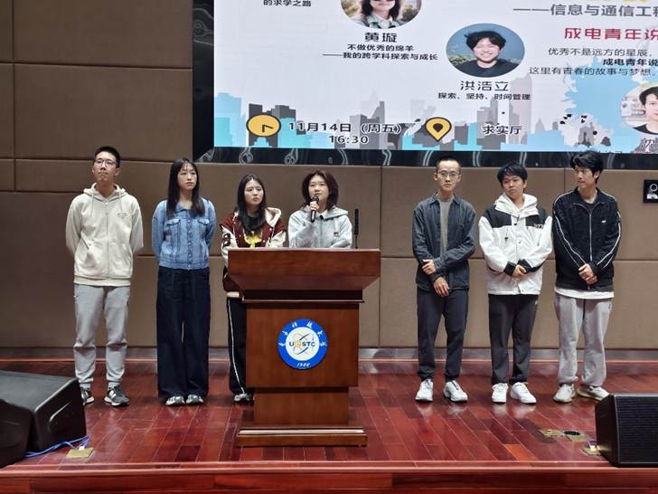 11月14日,公司大型青年互动演说分享节目 “成电青年说” 第59期在图书馆求实厅开讲。本次活动以“榜样引领,研途可期”为主题,邀请2022级优秀学长学姐张晰元、黄璇、洪浩立、沈浩然、蓝紫姗、杨涔可、张梓轩七位同学,围绕求学探索、跨学科成长、时间管理、全面发展等多个维度,分享他们的大学经历与青春感悟,为学弟学妹们点亮成长之路。