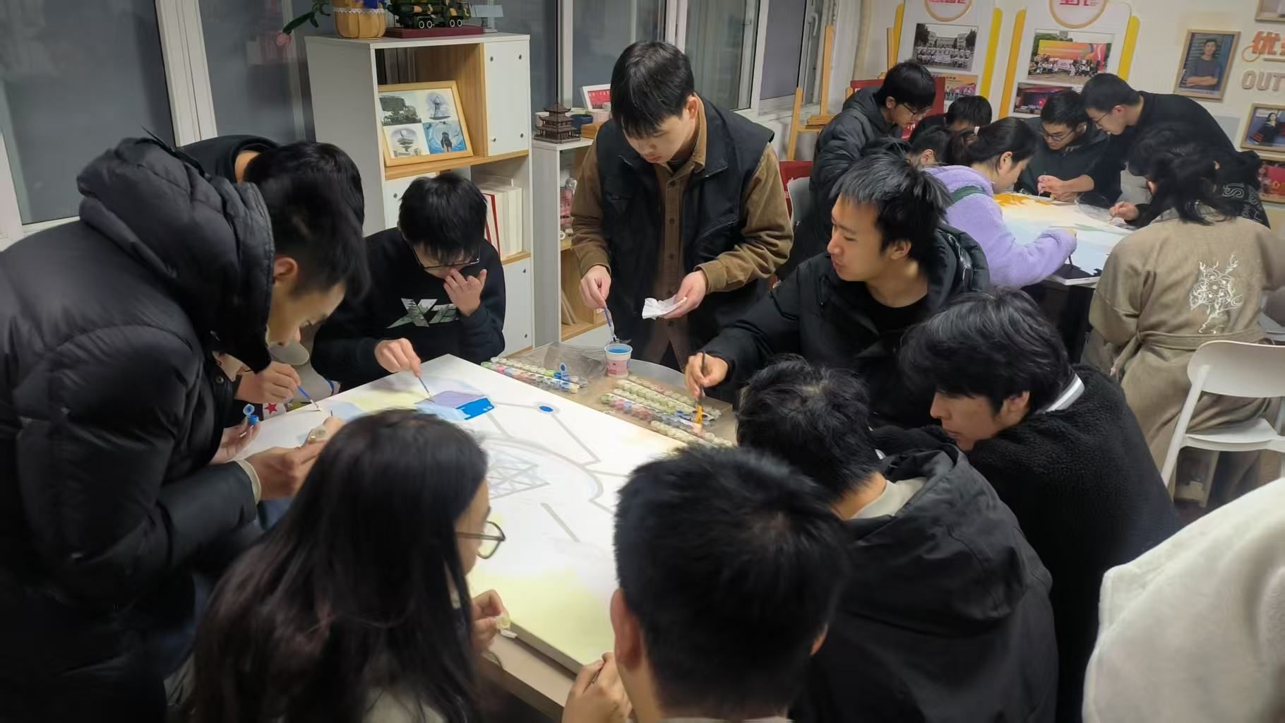 活动前期,同学们自发组队、分工协作,组建起红色文化、学科文化、传统文化三支创作小队。筹备过程中,红色文化小队成员围坐交流,分享红色基地社会实践足迹与理论学习心得,在思想碰撞中深化对革命精神的理解;学科文化小队聚焦专业领域,围绕科技发展趋势展开讨论,共同构思信息科技赋能智能化生活的未来图景;传统文化小队则深入研究传统节日内涵,分享民俗故事与非遗文化知识,为创作积累丰富素材。各小队还充分借助AI辅助绘画工具,将交流成果转化为创意构思,精心勾勒出兼具思想性与艺术性的主题画作雏形。