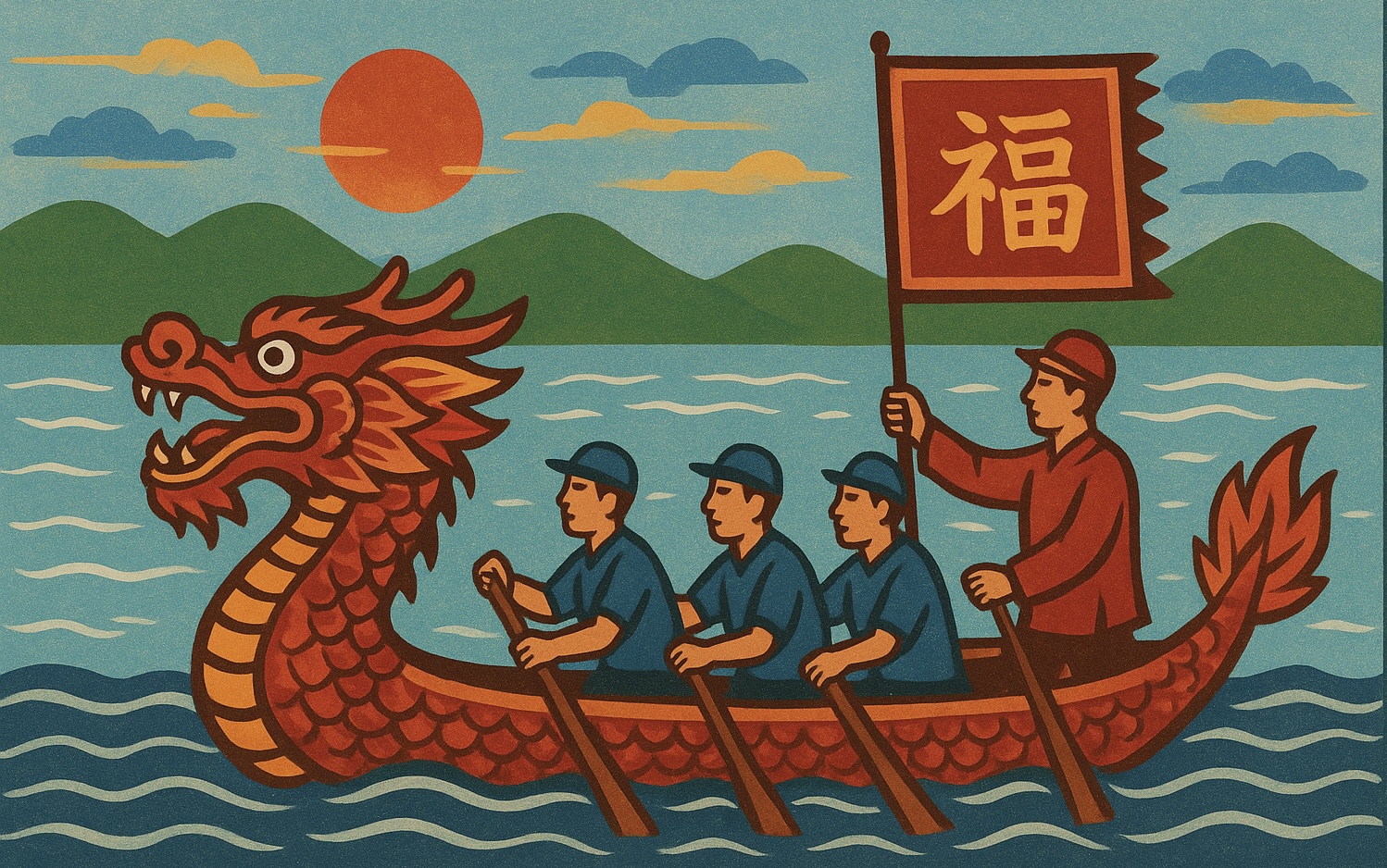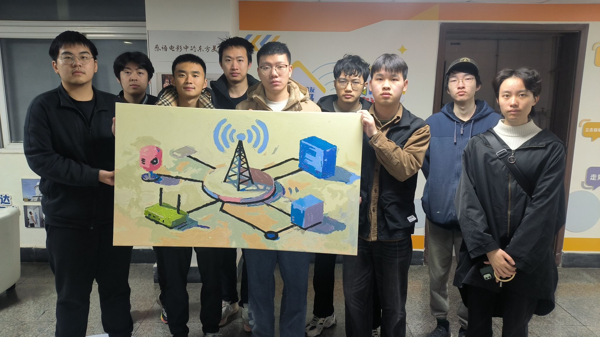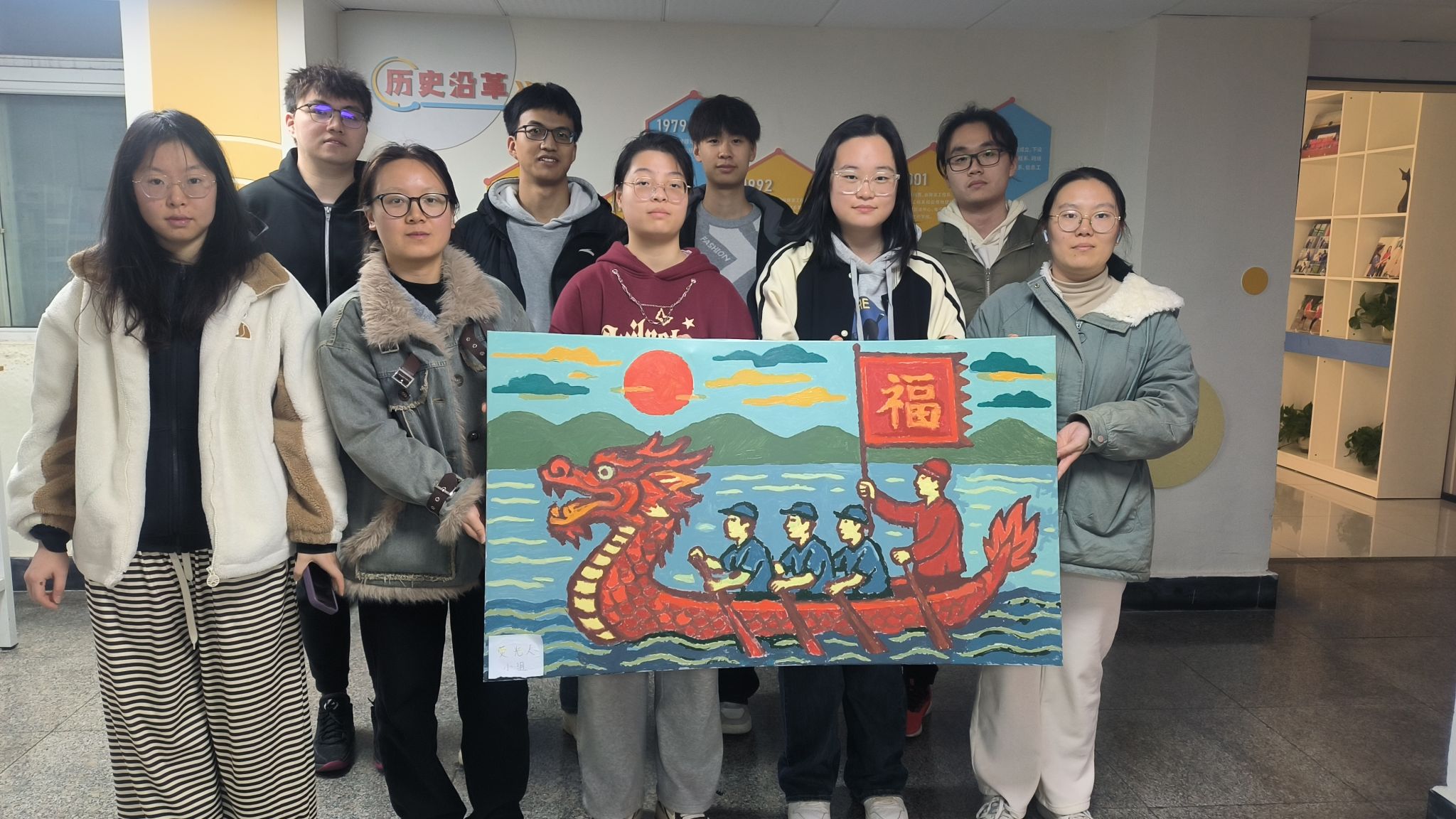 创作现场氛围热烈而专注,红色文化小队桌前,同学们围绕红船与现代化航母开展画布创作,用沉稳的红、黄两色勾勒画面,让“开天辟地、敢为人先”的红船精神通过画笔浸润心灵;学科文化小队这边,以通信基站、路由器、服务器等元素构成网络系统的图案前,同学们创新性地加入蓝紫色荧光线条,用艺术化网络系统展现“万物互联”的学科内涵,诠释信通人的科技报国初心;传统文化小队则聚焦龙舟竞渡场景图,画面中造型精美的龙舟、协作划桨的人员与“福”字旗帜充满民俗活力,大家以青、白、金为主色调细腻填充,展现端午文化中团结协作的精神魅力。