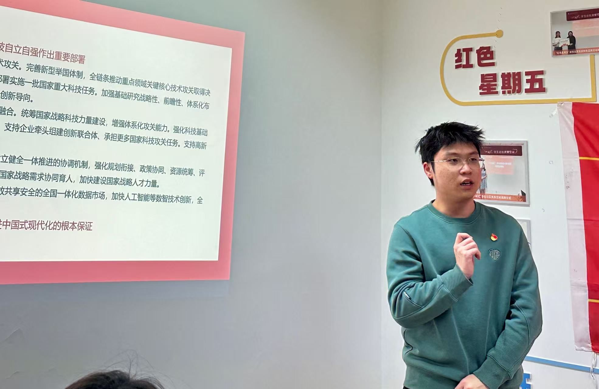 活动以专题学习与交流研讨相结合的形式展开。支部书记围绕党的二十届四中全会审议通过的《中共中央关于制定国民经济和社会发展第十五个五年规划的建议》进行领学,系统解读了“十五五”时期经济社会发展的指导方针、主要目标和战略任务,重点阐释了“科技自立自强”“新质生产力”等关键内容,引导同学们深刻理解国家发展大局与青年责任担当的紧密联系。