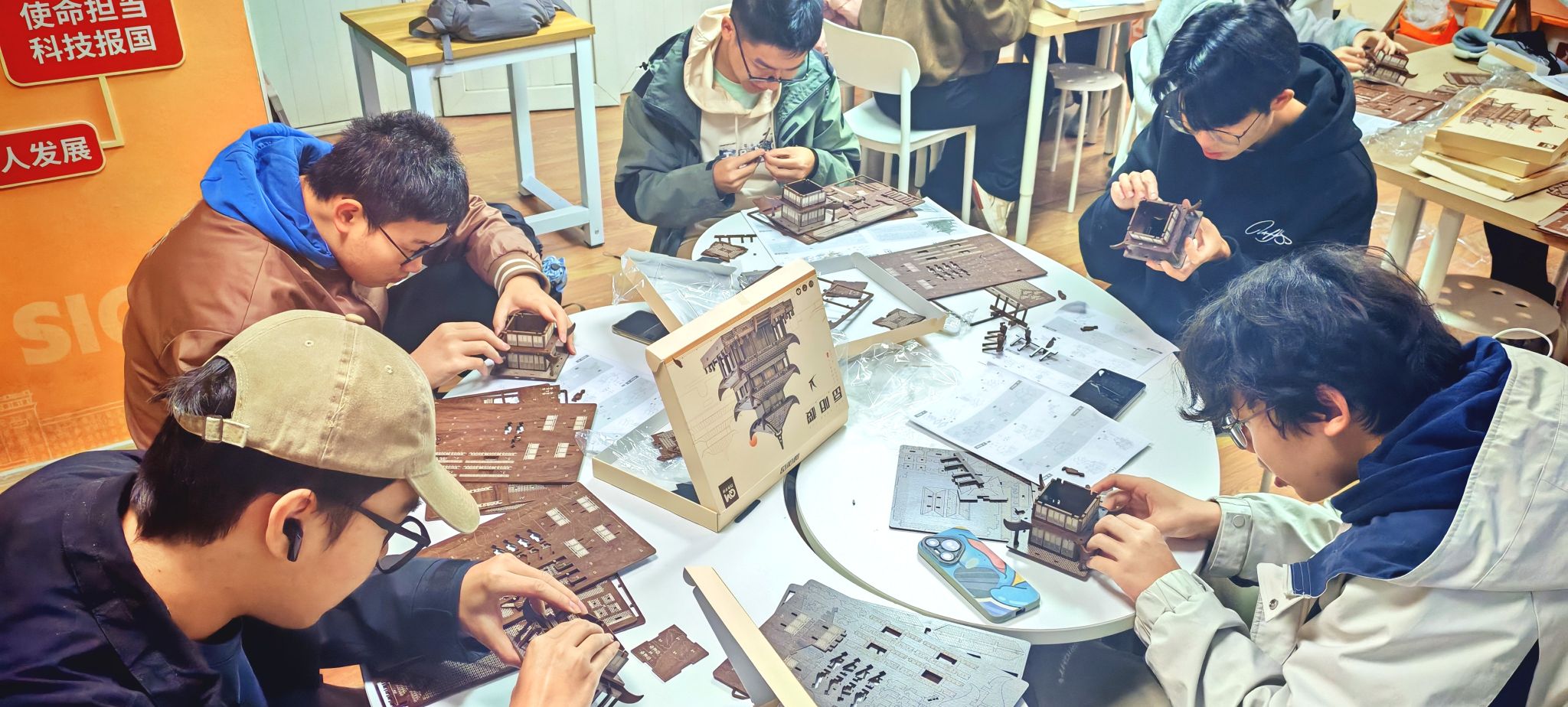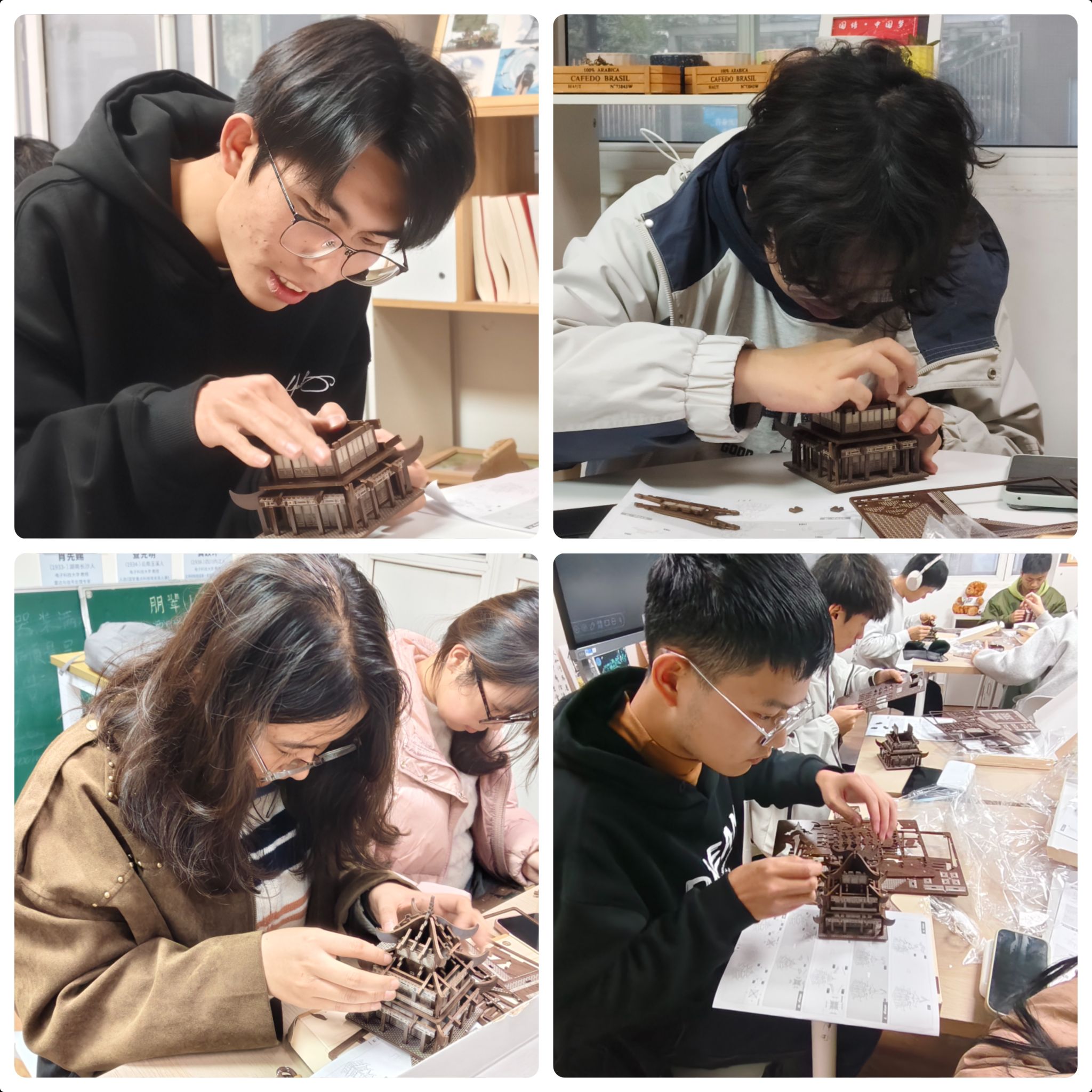讲解结束后,实践环节正式开启。工作人员为同学们分发榫卯楼阁模型套件,大家根据喜好自主选择黄鹤楼、岳阳楼等经典样式,迅速投入到搭建实践中。识别零件、找准接口、精准咬合,每一个步骤都考验着大家的耐心与专注力。现场氛围热烈而有序,同学们时而低头钻研组件说明,时而轻声交流拼接技巧,指尖翻飞间,原本零散的木构件逐渐成型,飞檐翘角的楼阁雏形渐显。