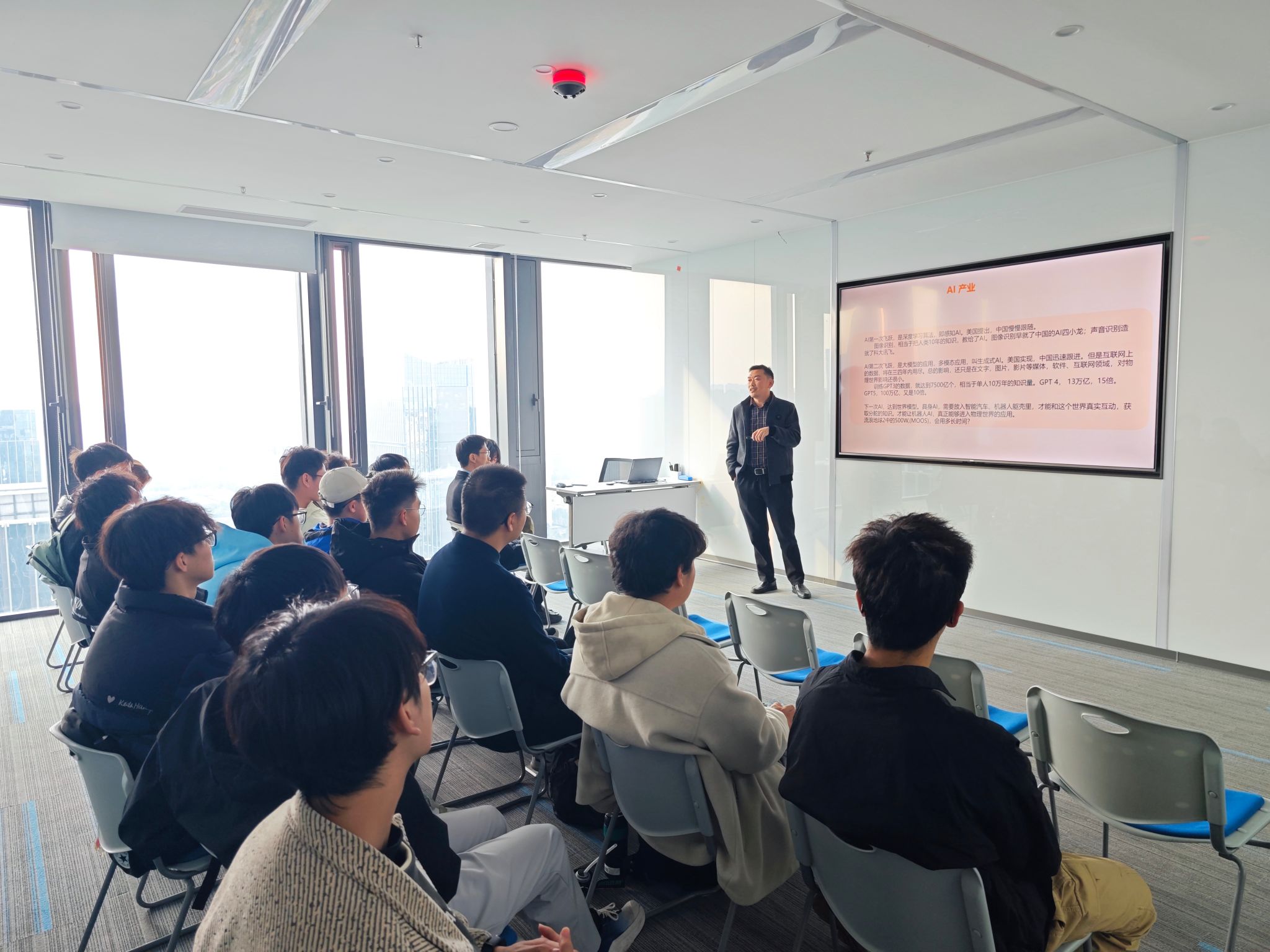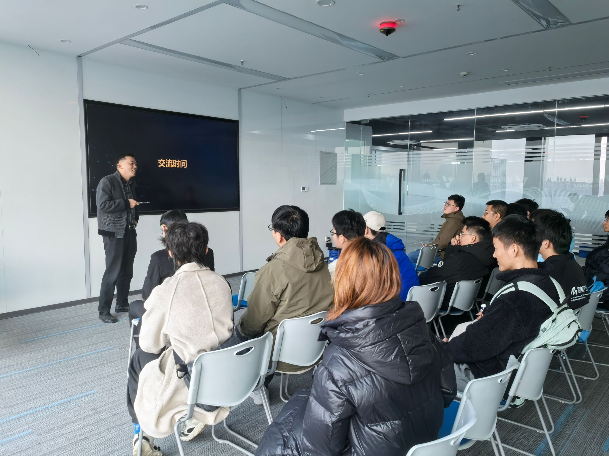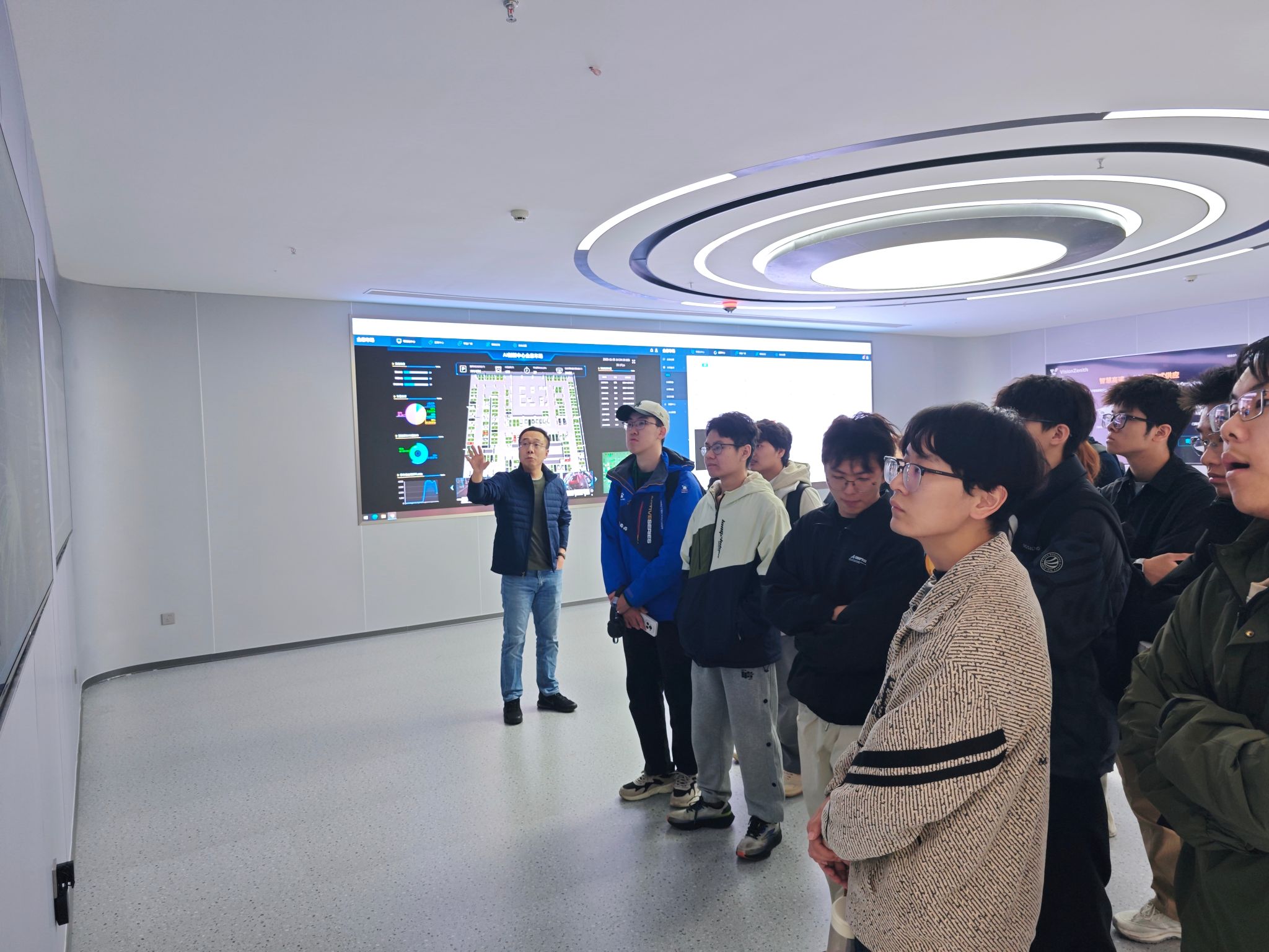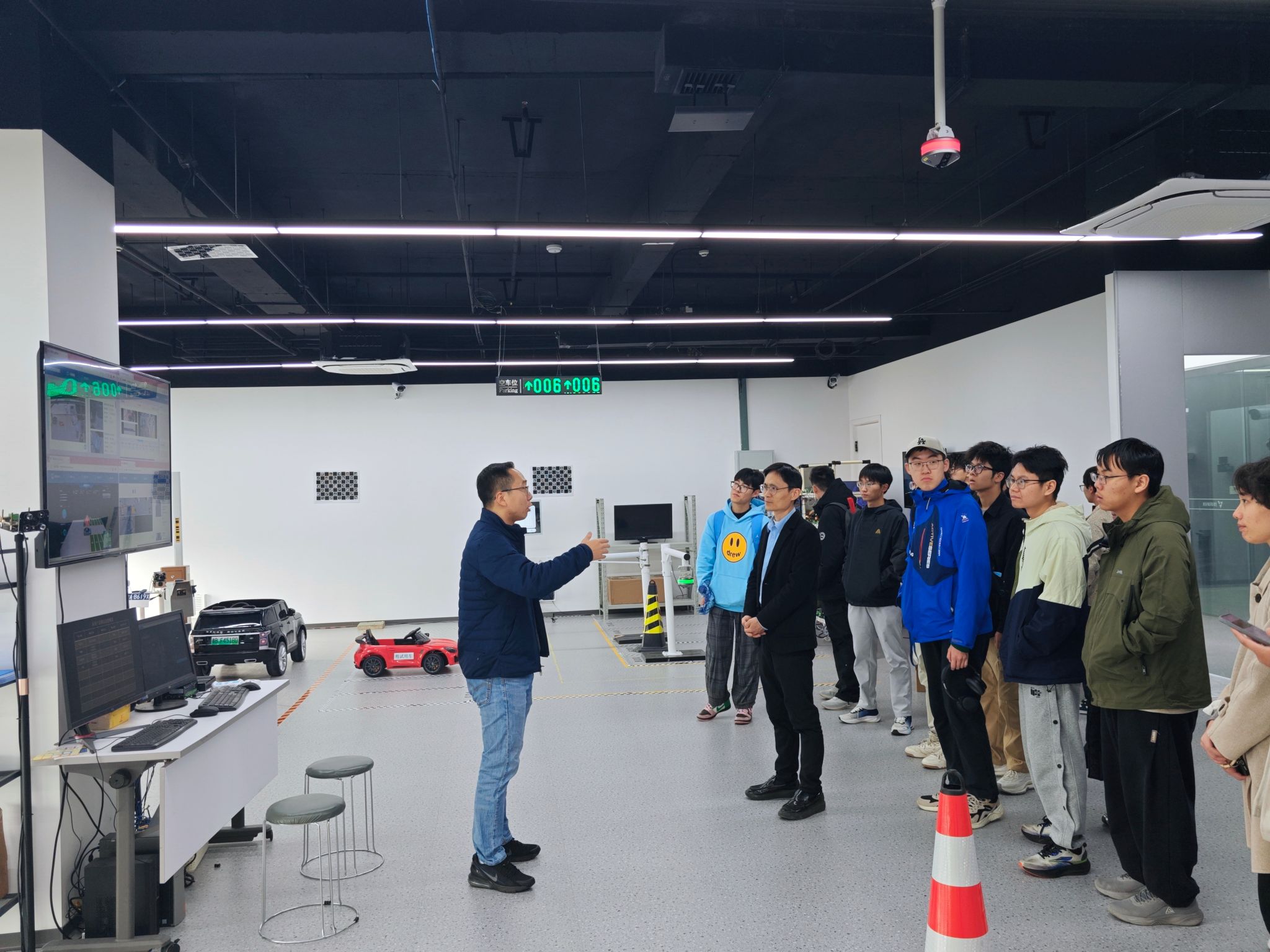 随后,王总为同学们介绍公司的解决方案及落地的行业应用案例,并通过大屏幕实时展示了全息地下停车场的实时监测、违停分析等功能,让同学们对公司的产品与行业应用有了直观且深刻的认识。