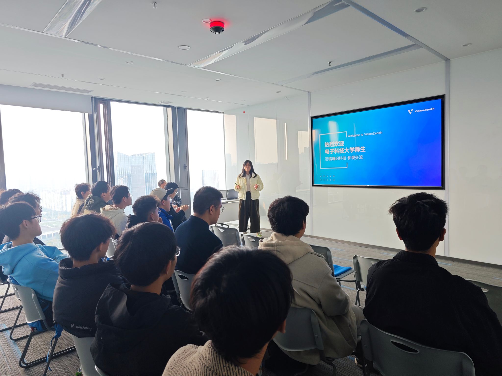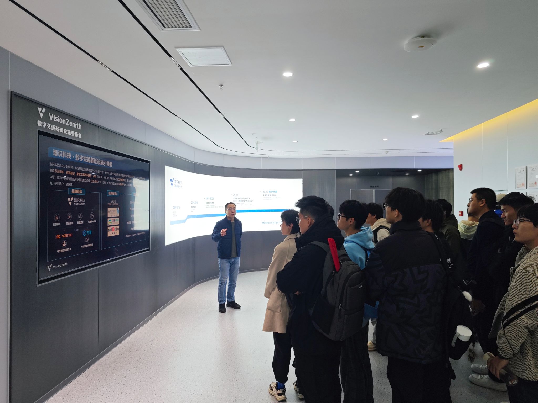 活动伊始,公司副总经理王蔚宇带领同学们首先参观了臻识科技公司展厅,详细了解公司发展历程、业务领域及行业成就,并近距离观察了公司自主研发的交通数据采集模块、智能抓拍设备、车牌识别终端等设备,让同学们看到技术落地的硬件形态。
