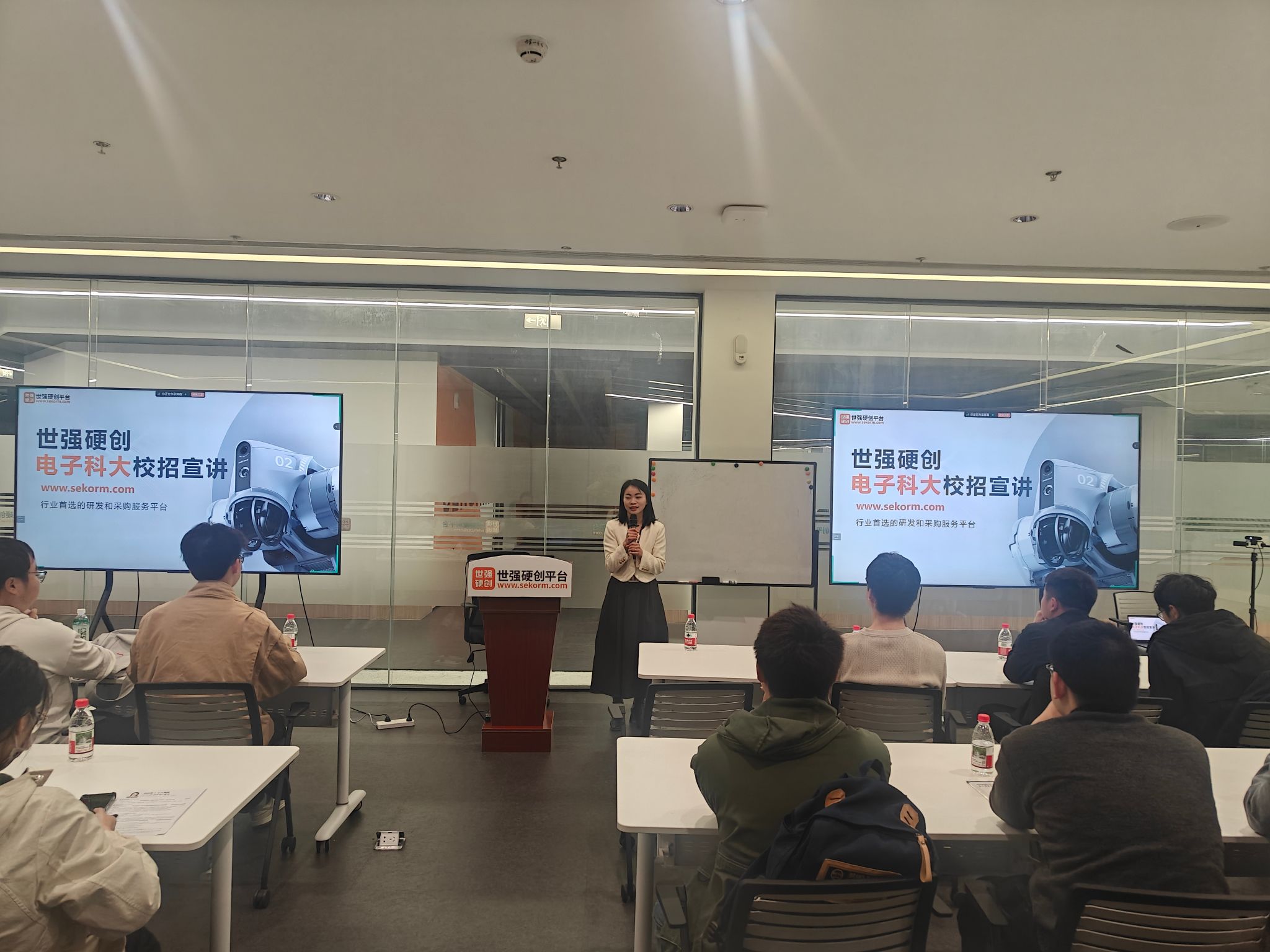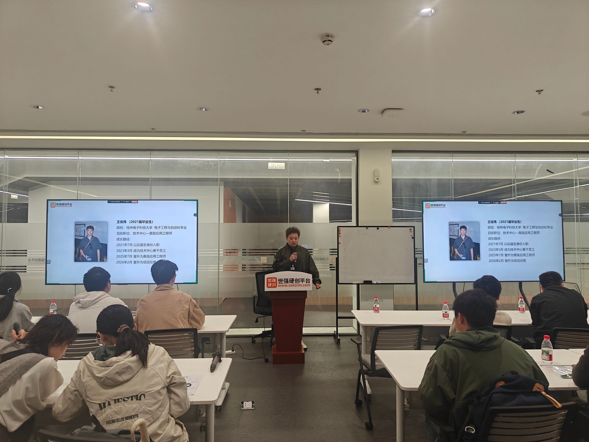 随后,2019届员工、世强先进科技产品总监张浩语,结合自身职业成长经历,分享了选择世强的初心与职场收获,从行业适配、个人发展等维度为学弟学妹提供了实用参考,帮助同学们更清晰地认知企业用人需求与职业发展路径。技术中心高级应用工程师王俊伟则聚焦硬件产品创新趋势、AI 产业前沿动态等热门话题展开分享,结合多年行业实践经验,针对性解答同学们在生涯规划、技术提升等方面的困惑。