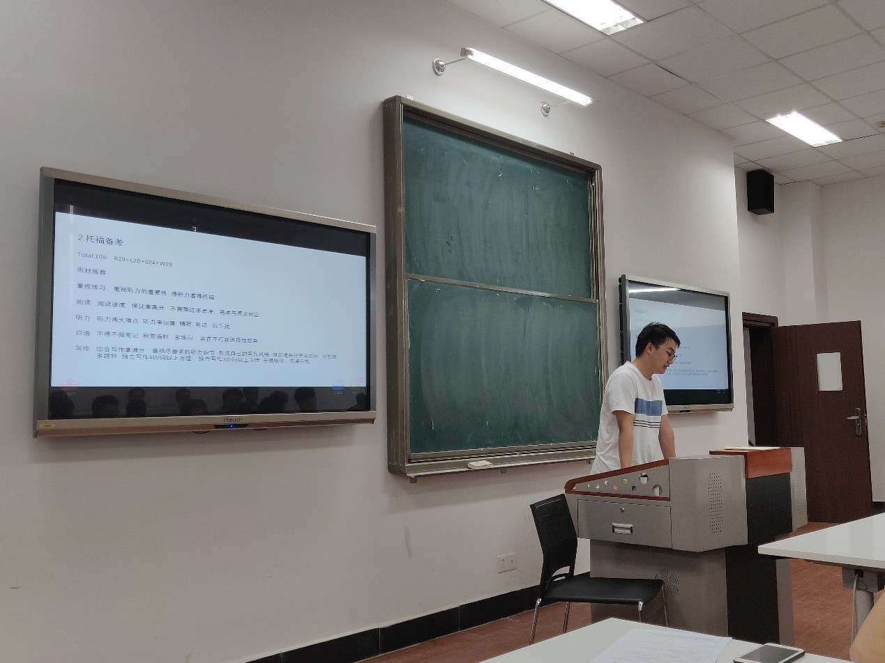 然后申请到剑桥大学、托福109、GRE329+4常浩学长向大家详细讲述了语言考试的技巧,他表示语言考试准备时,单词的重要性,他的个人方法是:乱序背诵,落实笔头,尊重遗忘曲线和留足时间。而对于托福备考,需要因材施教,重视练习,重视听力的重要性,得听力者得托福等,并从阅读,听力,写作和口语等方面介绍了托福备考的方法。后面又从GRE,雅思和英美申请的区别做了详细讲述。