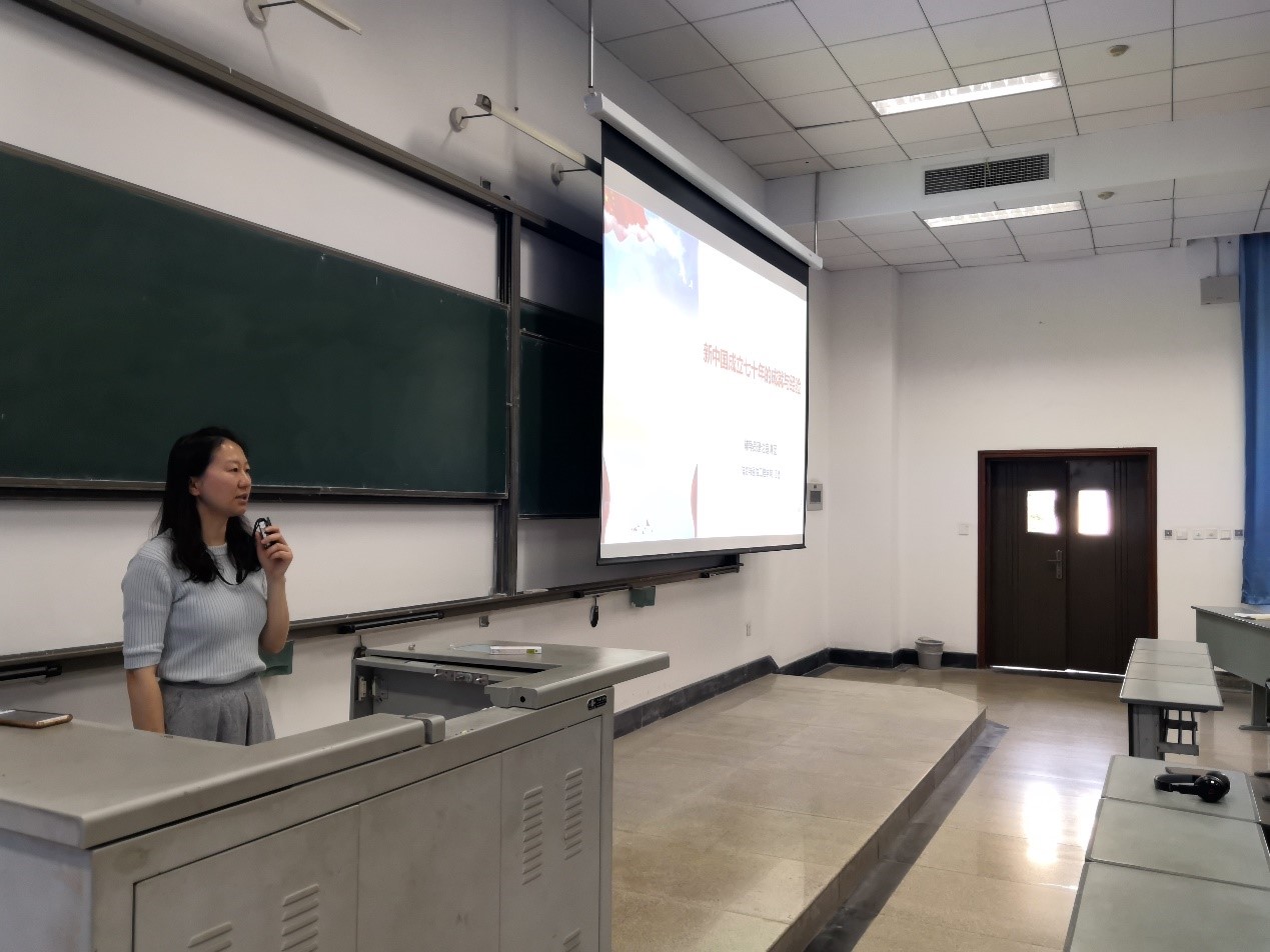 随后,江倩老师以“从站起来,到富起来,再到强起来的70年”、“从新中国,到新时期,再到新时代的70年”、“从不挨打,到不挨饿,再到不挨骂的70年”三个部分,图文并茂地为大家简述了新中国成立70周年以来如何从一个落后的封闭型经济弱国到开放型全球经济大国,人民是如何从贫穷到富裕。