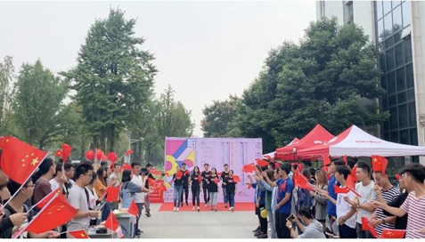 宴会开始前,舞台前红毯两侧同学们挥舞小国旗,在院员工会学长学姐们引领下,现场同学齐声高唱《我和我的祖国》,表达了同学们对新中国70周年生日的诚挚祝福,对中国继续富强和谐的衷心祝愿,以及对公司成立63周年的美好期望。