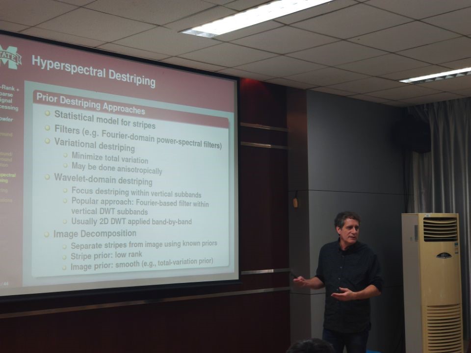 本次报告中,Jr.教授首先简单介绍了鲁棒性主成分分析(RPCA)的背景,许多信号处理问题都可以看成从观察信号中分离低秩信号和稀疏信号(噪声),接着Jr.教授从大家熟悉的主成分分析(PCA)模型,清晰的回顾了RPCA的历史发展,其中包括数学模型的发展,求解框架的发展等。随后,他讲解了当前RPCA存在的问题,并介绍他们团队解决该问题的算法(DECOLOR)及其在前景和背景分割的应用。最后,Jr.教授介绍了RPCA在高光谱图像降噪、聚类上的应用,并总结RPCA在信号处理领域的优点。