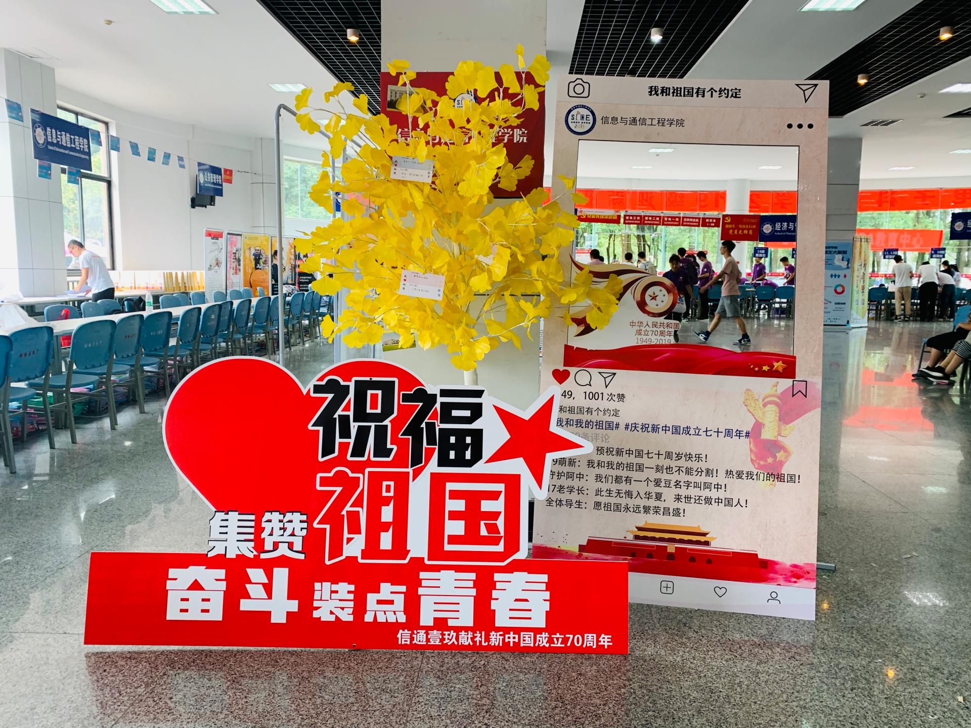 2019年是新中国成立70周年,自新生入校以来,公司就围绕庆祝新中国成立70周年,开展了一系列以爱国主义为核心的理想信念教育,提升员工思想素质。迎新期间,公司组织“集赞祝福祖国,奋斗装点青春”主题活动,在新生报到时发放梦想卡片,写寄语祝福伟大祖国、畅想奋斗青春,在校园内集齐“信通壹玖”印章,装点成电银杏树,旨在鼓励新生做新时代奋斗青年。