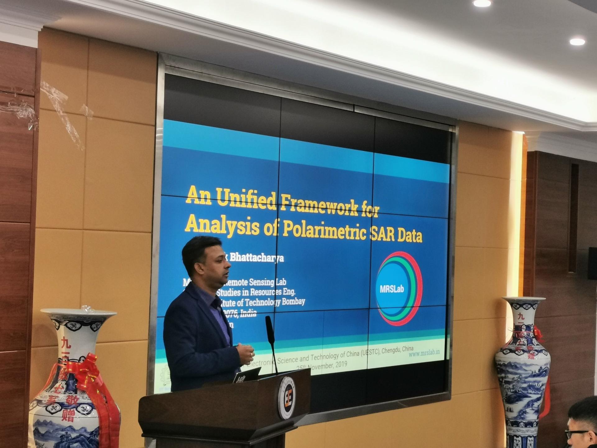 来自Indian Institute of Technology Bombay的Avik Bhattacharya教授作了题为《An Unified Framework for Analysis of Polarmetric SAR Data》的报告。教授先简要介绍了雷达极化性质,及其在农业,生态,海洋,地址等地球观测方面的应用类别;进而介绍了极化SAR数据两方面重要模型:物理模型及几何模型,并介绍了具有roll-invariant的散射参数模型及其同传统参数模型的对比;在极化SAR应用方面,Avik Bhattacharya教授着重介绍了其在农业农作物生长状态检测方面的具体应用。对于科研工作,Avik Bhattacharya教授强调,在分析研究问题时,需要向深处思考,向本质处探索。