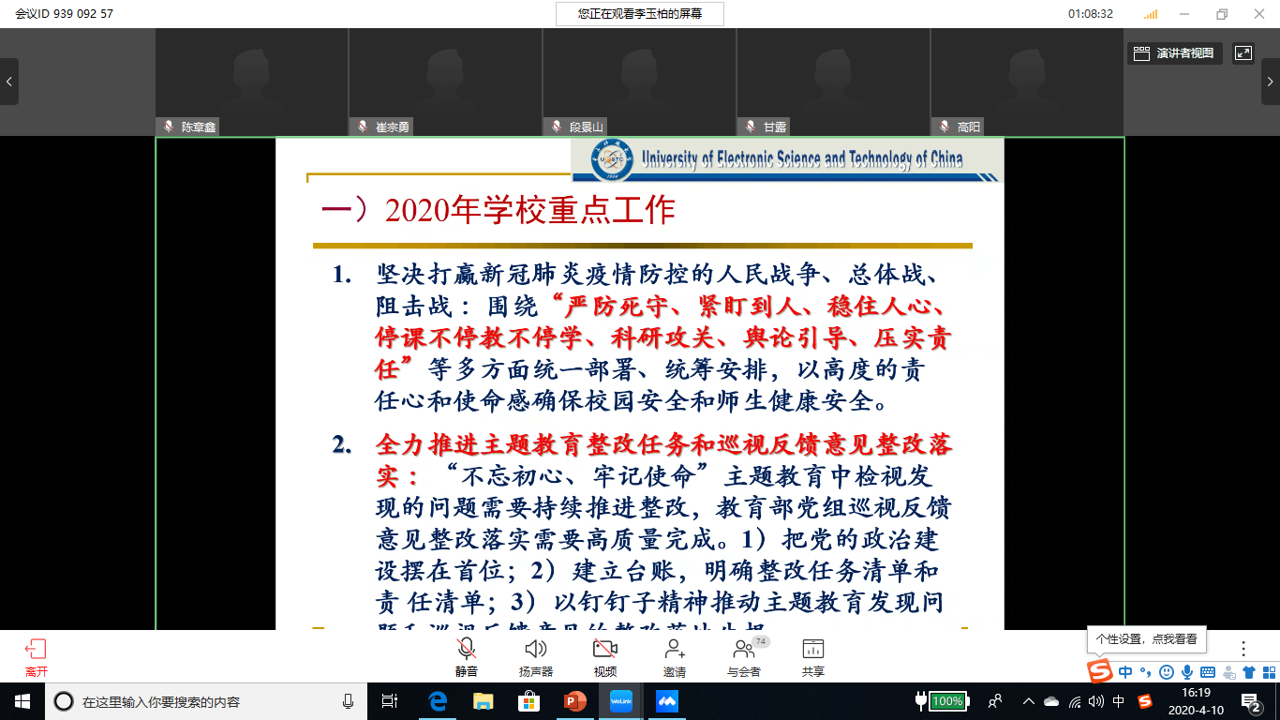 经理孔令讲从疫情防控、党建工作、团队建设、团队队伍、本科生培养、公司产品、科学研究、国际合作与交流、员工工作和保障体系十个方面,对公司2020年工作要点进行了部署和指导,孔令讲说到:公司要始终高举中国特色社会主义伟大旗帜、深入学习贯彻习总书记关于教育的重要论述和全国教育大会精神,增强“四个意识”,坚定“四个自信”,做到“两个维护”,坚持立德树人根本任务,以学科为统领,促进公司深度融合,推动公司快速发展。