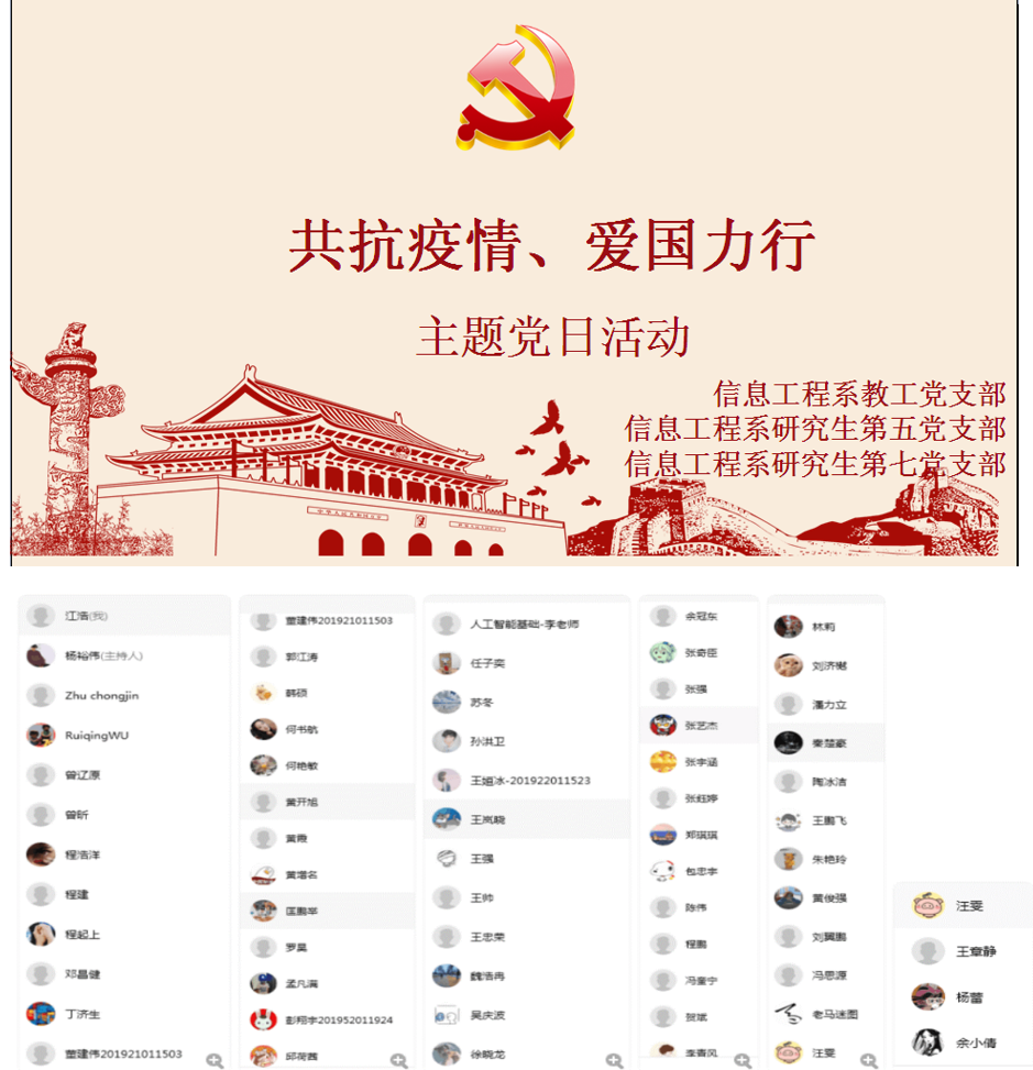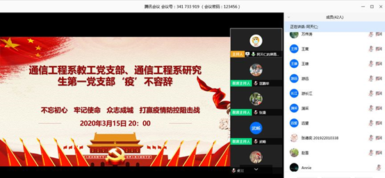 通信工程系研究生第一党支部与通信工程系教工党支部联合开展“‘疫’不容辞”线上主题党日活动,师生集体学习习近平总书记赴湖北省武汉市考察疫情防控工作重要指示精神,老师们就同学们关心的学位论文写作和科研工作开展进行了广泛而深入的交流,为同学们面临的问题给出了充分的指导和帮助,并鼓励大家在严格遵循国家对于疫情防控工作的要求的同时,保持适度紧张,不松懈、不浮躁,克服一切困难,利用网络资源不断给自己充电。