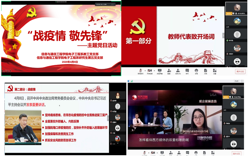 电子工程系教工党支部与研究生第五党支部联合开展“战疫情、敬先锋”主题党日活动。师生共同学习习近平总书记在4月8日中共中央政治局会议上的重要讲话,共同观看《这就是中国——全球抗“疫”中的中国担当》节目以及《战疫故事》系列直播,并就此次活动学习观看内容与疫情期间的科研学习感悟进行相互交流与分享,增进了师生党支部的凝聚力。