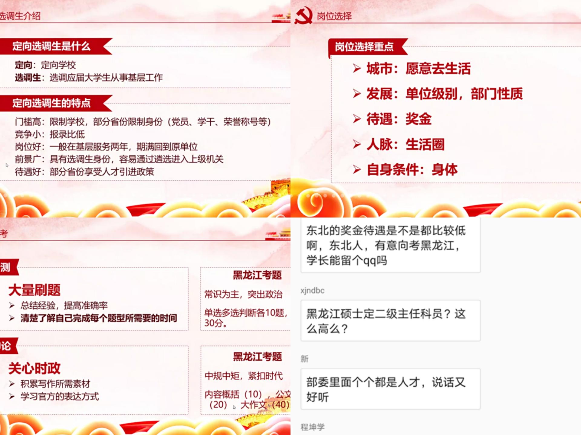 郑昊天师兄就自己选调生的经历给大家进行了分享。他主要从地域城市,职业发展,薪酬待遇,相关人脉,身体素质和准备经验这些方面让同学们对选调有了更深的理解。