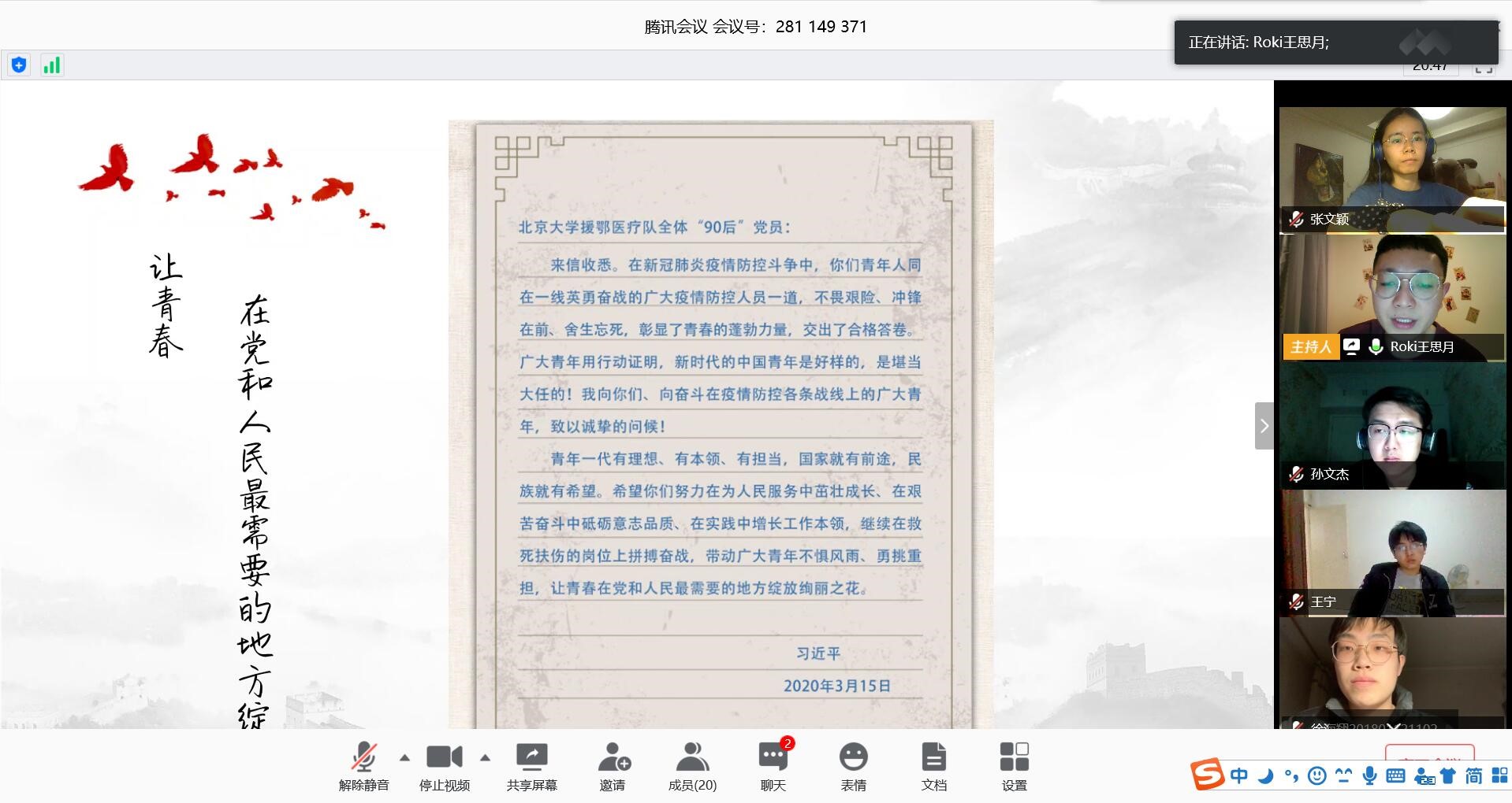 4月12日,新葡的京集团35222vip本科第八党支部以线上连线的方式组织支部全体党员共同学习习总书记给北京大学援鄂医疗队90后党员回信重要精神,学习会议由党支部书记王思月主持,党员同学们就总书记的回信内容进行展开广泛交流。