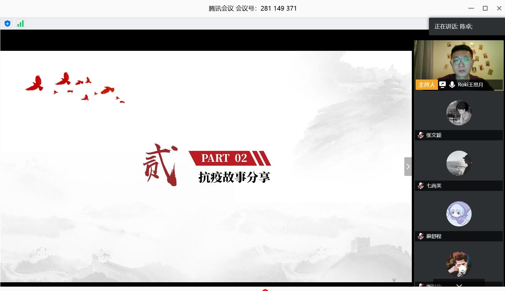 最后,身处疫情中心武汉的支部宣传委员陈卓,为支部党员讲述了发生在她身边的医务人员和基层工作者令人感动抗疫故事。她激励党员同学们不论在什么时期都要遵从党的领导,永远跟党走。作为老员工党员,要用爱国奋斗的精神去影响身边的同学,将个人未来和国家前途紧密结合,带动广大青年同学共同将青春之花绽放在党和人民最需要的地方。