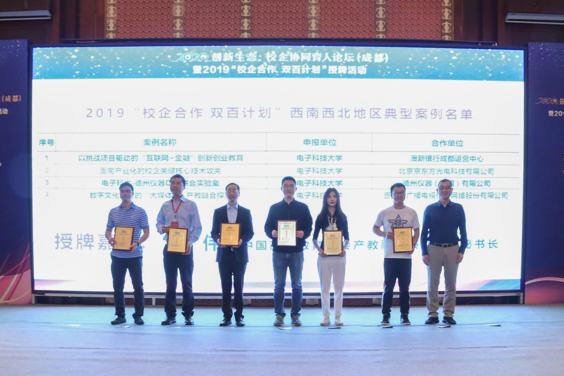 会上,王小梅、吴英策、陈伟等分别为2019年度西南西北片区“校企合作 双百计划”典型案例单位进行了授牌。公司与四川华迪信息技术有限公司合作案例“校企共建一流实训基地,引领工程教育改革,培养IT卓越人才”;与英特尔(中国)有限公司合作案例“Intel产学合作——“智能嵌入式系统的设计与应用”课程建设”以及与德州仪器(中国)有限公司合作案例“电子科大-德州仪器DSP联合实验室”等三个典型案例喜获授牌。公司教师代表何春、何翔、凌翔分别上台接受典型案例授牌。