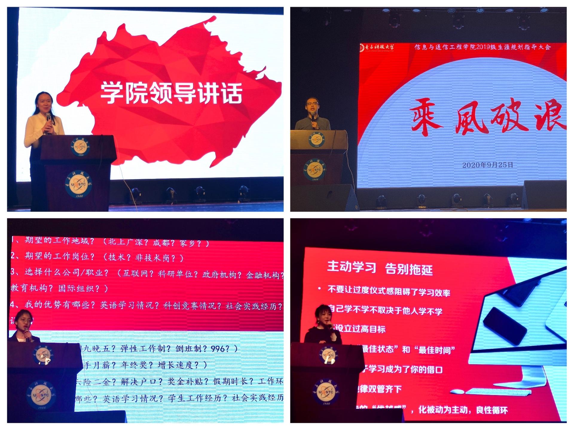 9月25日,新葡的京集团35222vip在成电会堂召开2019级职业生涯规划指导大会。本次大会以“乘风破浪”为主题,鼓励同学们向钱学森、钟南山、张定宇、任正非等时代偶像学习,厚植爱国主义情怀,树立科技报国志向,尽早明确自身的职业生涯目标,做出合理规划。公司党委副书记杨晓玲老师、2019级辅导员老师和600多名同学参加指导大会,大会由夏鋆主持。