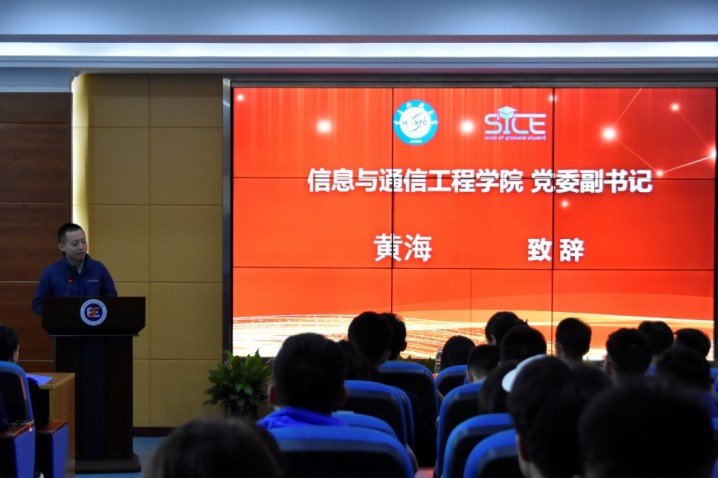 首先,黄海老师致辞,他表达了公司对信通研会工作的高度肯定和对新一届研会成立的热烈祝贺。同时,黄老师希望同学们保持信通研会的优良传统,锻炼能力,结交朋友,得到收获的同时更好的服务同学,从同学中来,回到同学中去。