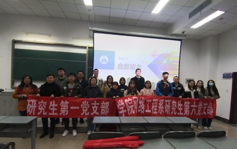 活动结束,大家合影留念。网络工程第六党支部书记柏林长春同志表示,此次活动密切了支部与烽火科技有限公司的联系,促进了高校支部和企业单位支部共建,希望通过王睿同志的分享答疑,解决支部同志对于疫情影响下的行业现状及求职方面的疑问,深度促进双方的合作交流。