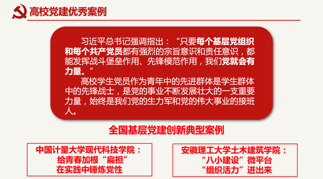 本次会议分为六个部分,分别为学习强国情况的研讨、党员发展情况、党史学习、支部共建、党员档案的管理以及部分研究生党支部书记分享的党建共享优秀案例。