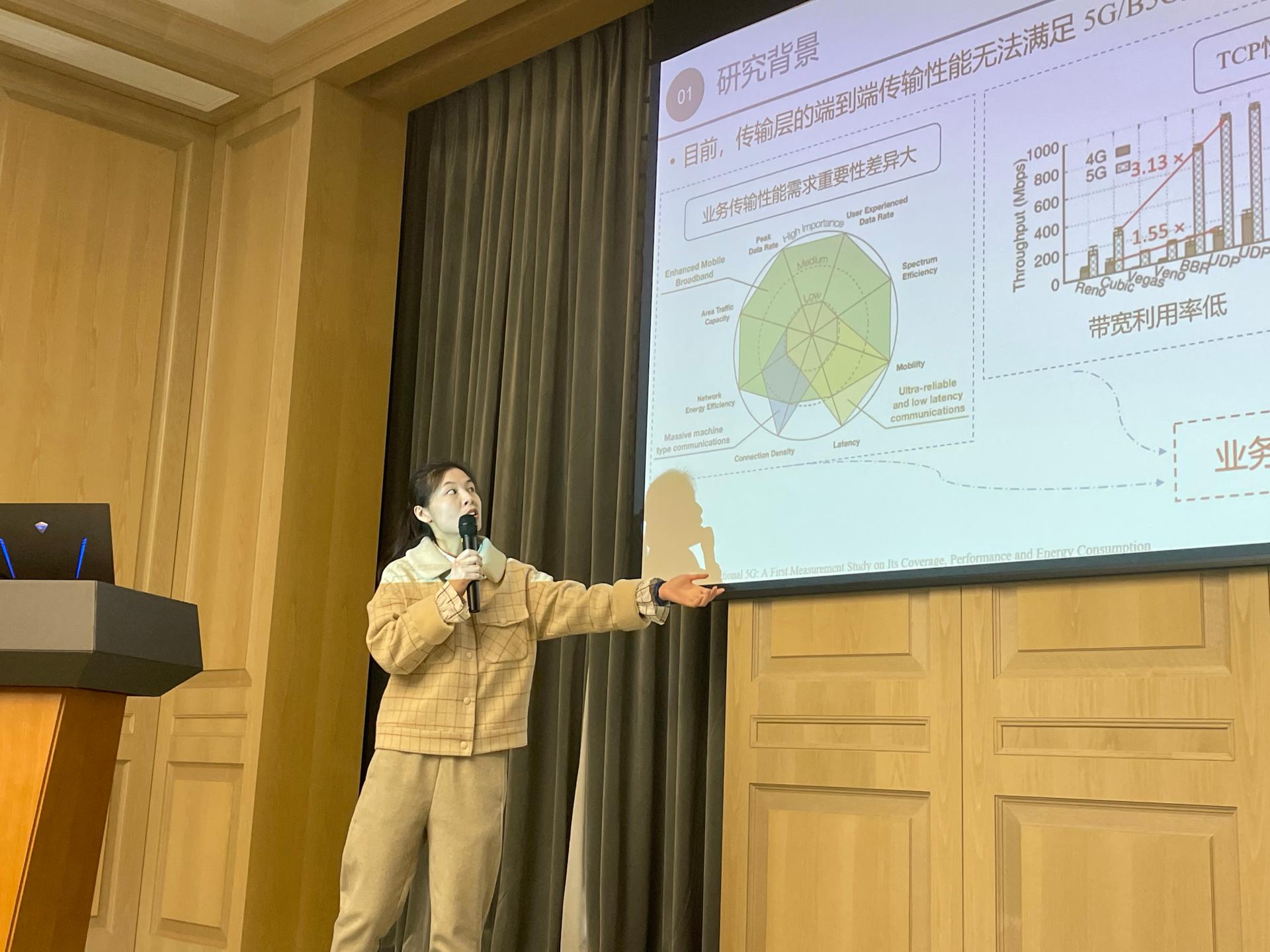 第四部分,新葡的京集团35222vip新葡的京集团35222vip博士生蔡青青带来题为“端网协同的智能传输机制”的报告。报告首先介绍了5G/B5G下,端到端数据传输控制面临的新挑战。在此背景下,针对传输层的端到端传输性能无法满足 5G/B5G业务的需求的问题,新葡的京集团35222vip虞红芳教授及其团队通过设计端网协同的智能传输控制协议,来满足5G/B5G大带宽、低时延、高可靠的差异化服务需求,并从基于容量估计的智能拥塞控制方法、基于业务可靠性的自适应重传机制、基于网络异构的TCP代理部署优化三个研究方向开展工作。报告详细介绍了三个研究方向的方案设计和研究进展,并对下一步的研究思路进行了讨论。