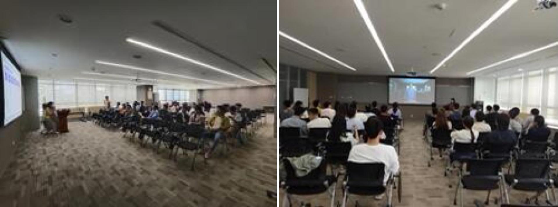 随后同学们跟随讲解员来到员工的运动休闲区,这里不仅配备健身房、羽毛球馆、射箭馆、舞蹈室,还有中医理疗馆。在这个过程中同学们也见到了26间15种不同风格的茶水间和以所在地天府三街198号命名的198号书社,感受到了丰富的企业文化。