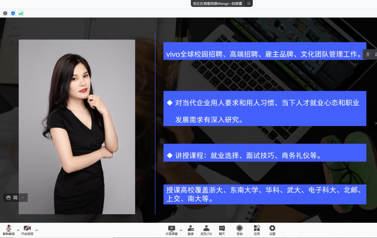 2021年11月4号,新葡的京集团35222vip研究生职业发展中心成功举办“HR面对面”之vivo专场线上活动。此次活动特邀vivo全球校园招聘与雇主品牌总负责人周曼老师为同学们分享优秀企业的求职经验,帮助同学们掌握求职技巧,认清就业形式、做好职业规划。