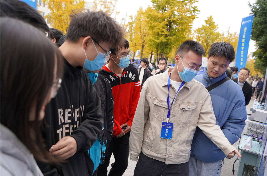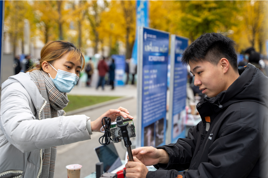 第二个会场是员工作品展,来自挑战性课程、新生项目课程、科研育人、顶点计划的员工作品陈列在科研楼门前广场,包括“智能墨水屏”、“宿舍升降机模型”、“小盼的口红商店”等36组充满创意且好玩的作品,吸引了来自全校的老师员工驻足参观。
