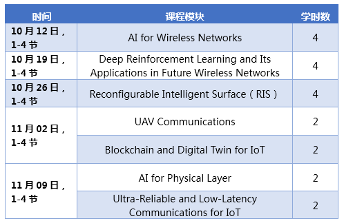 在课程酝酿之初,课程负责人就提出了课程内容上要体现“前沿”“创新”“趋势”的基本要求。经过课程组专家精心筛选,最终确定了“人工智能与机器学习在下一代无线网络中应用”“潜在的突破性通信技术:智能反射面技术”“基于无人机的天、空、地通信系统”“基于数字孪生(Digital Twin)新一代物联网(IoT)”“超低时延、高可靠通信技术”等教学内容。