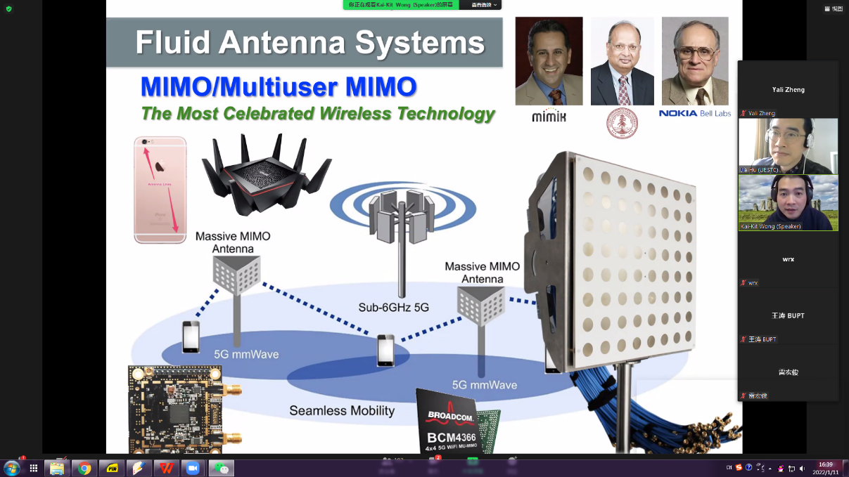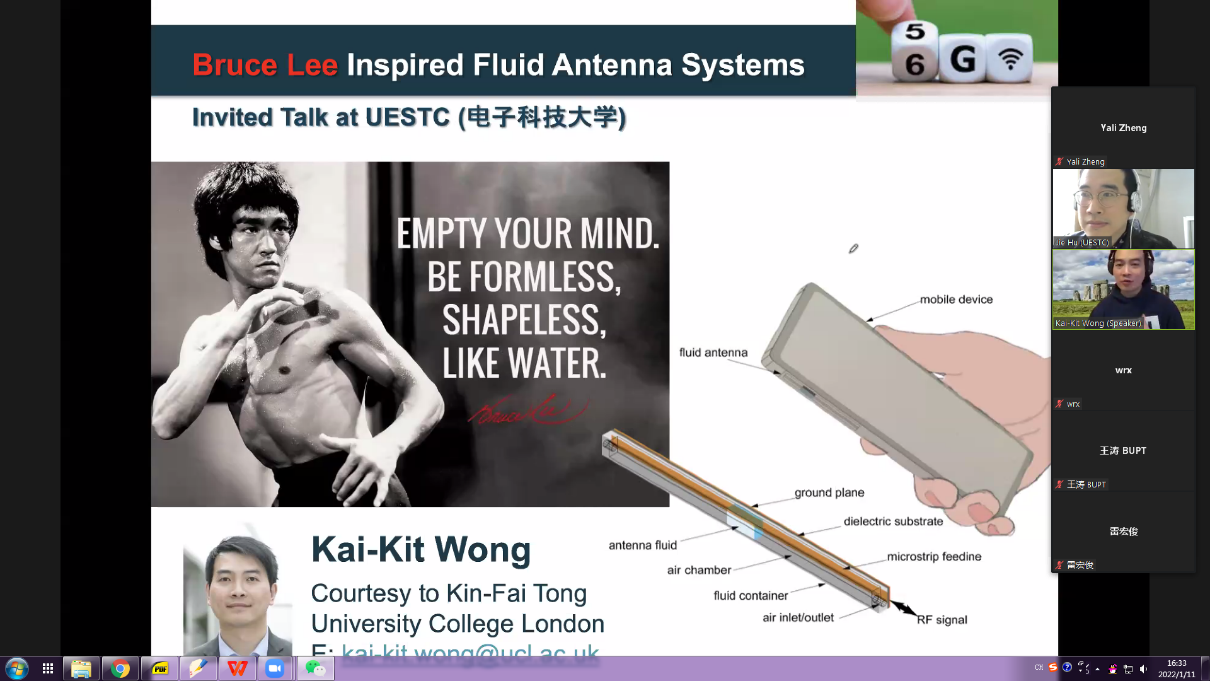 1月11日下午,由人力资源部教师发展中心主办、新葡的京集团35222vip承办的“名师讲堂”邀请到IEEE Fellow、英国伦敦大学公司教授Kai-Kit Wong,作主题为“Bruce Lee inspired Fluid Antenna Systems for 6G”的线上精彩报告。本次学术交流活动由新葡的京集团35222vip胡杰研究员主持。