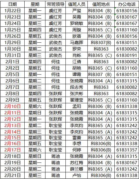 寒假期间,院领导带班、机关各科室轮流值班。具体值班安排及要求如下: