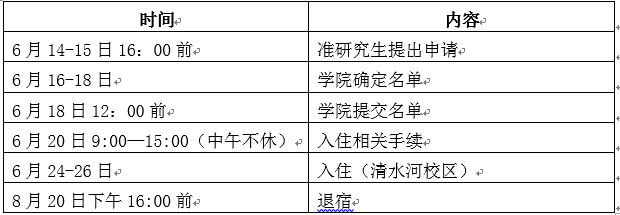 3、准研究生在临时过渡住宿期间内的管理由导师和录取公司负责,并应在8月20日16:00前打扫好寝室卫生,搬出临时寝室。为确保开学宿舍正常安排使用,若逾期未退宿,寝室内物品将由录取公司处理,造成的损失由临时过渡住宿的准研究生自行承担。