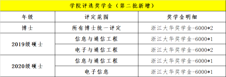 新增第二批公司评选奖学金:浙江大华奖学金,经公司研究生奖学金评审委员会讨论通过,具体名额分配如下: