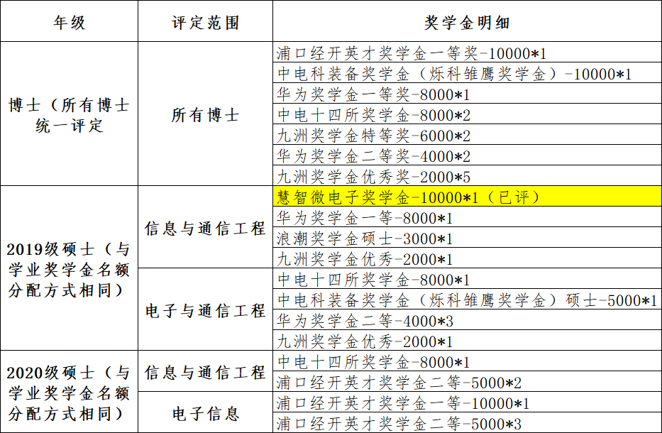 公司评选奖学金包含浪潮奖学金、浦口经开英才奖学金、中电14所奖学金、九洲奖学金、华为奖学金、中电科装备奖学金,该类奖学金为等额评选,由公司进行评选并确定获奖名单。具体名额分配如下:(以下名额经公司研究生奖学金评审委员会讨论通过,包含已评选的专项奖学金(已标黄)和待评选的专项奖学金,本次仅申请待评选的奖学金)