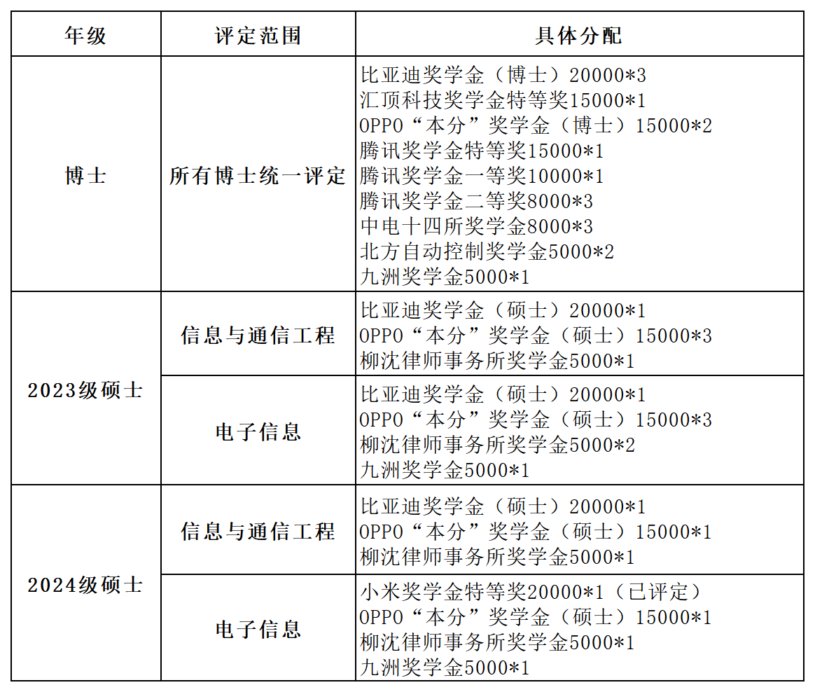 专项奖学金包含比亚迪奖学金、小米特等奖学金、腾讯奖学金、中电十四所奖学金、汇顶科技奖学金、北方自动控制奖学金、柳沈律师事务所奖学金、九洲奖学金、OPPO“本分”奖学金。
