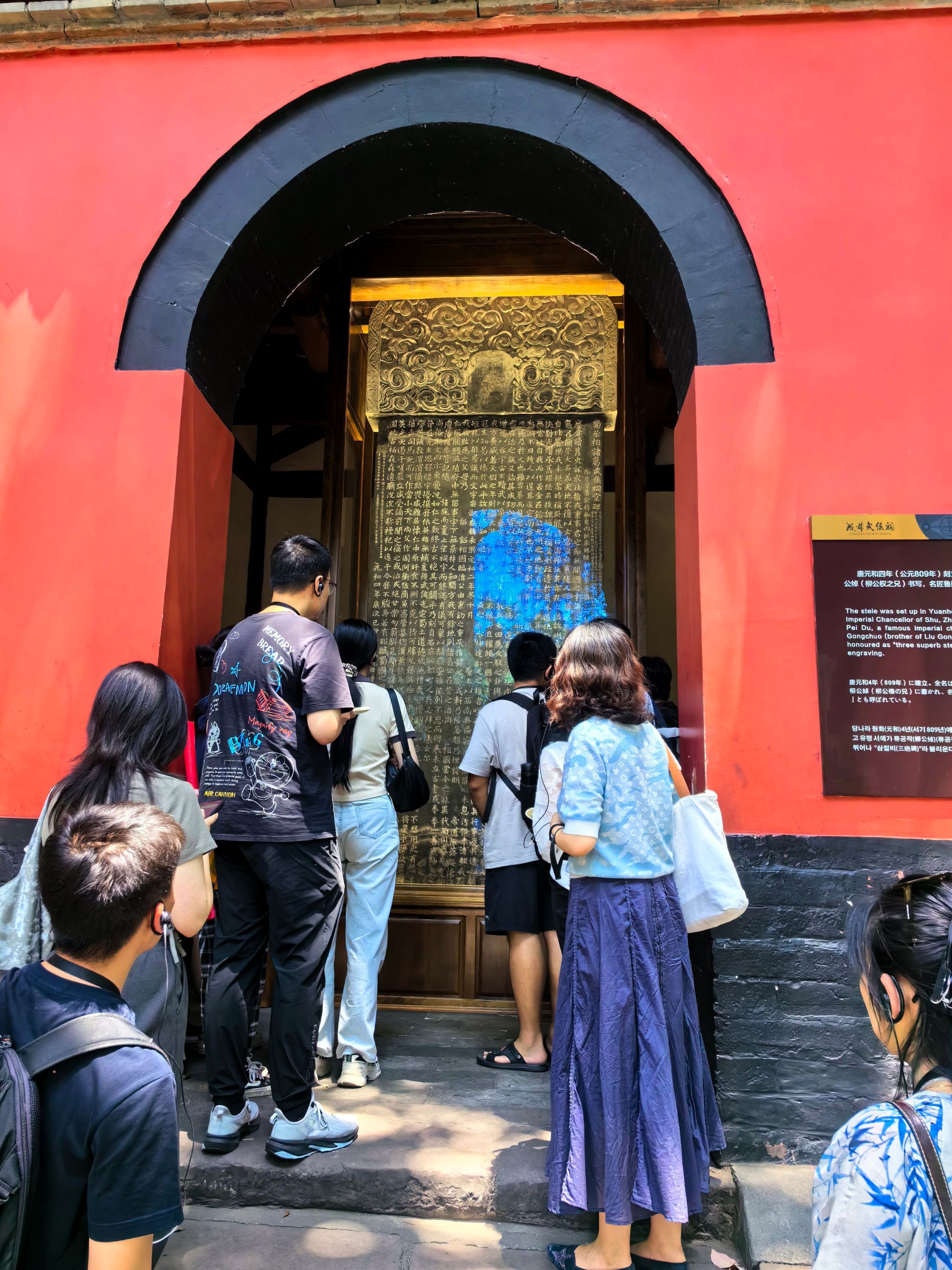师生党员沿着廉洁教育专线,跟随着讲解员依次参观唐碑、汉昭烈庙、静远堂等三国历史遗迹,深入了解以诸葛亮、刘备、关羽、张飞等为代表的爱国名将的历史事迹,接受廉洁文化浸润,身临其境地体会蜀汉人物以身作则、身体力行的廉政精神和清正廉明的品质。